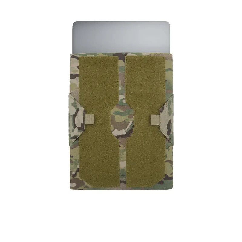 It has a loop exterior for attaching additional loop-backed pouches, patches and more. Hook-backed-wings secure the laptop sleeve onto the inside of your AMAP III or other velcro-lined pack, but can also be flipped 360 degrees to create a firm hand-hold for when you are carrying your laptop outside your pack.