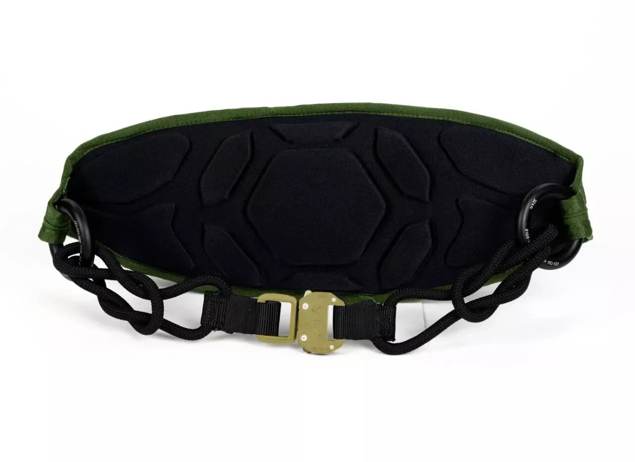 The Gela fanny pack has 2 large pockets backed with a super comfy EVA foam padding. The waist band is constructed with rope and are connected to the pack by aluminum O-rings. It is secured by a 1" black ADF Raptor aluminum buckle. The main pocket is secured by a 1" red Raptor buckle to accent the black 1050D. This can be carried as a fanny pack or across the chest, hence the bandoleer.