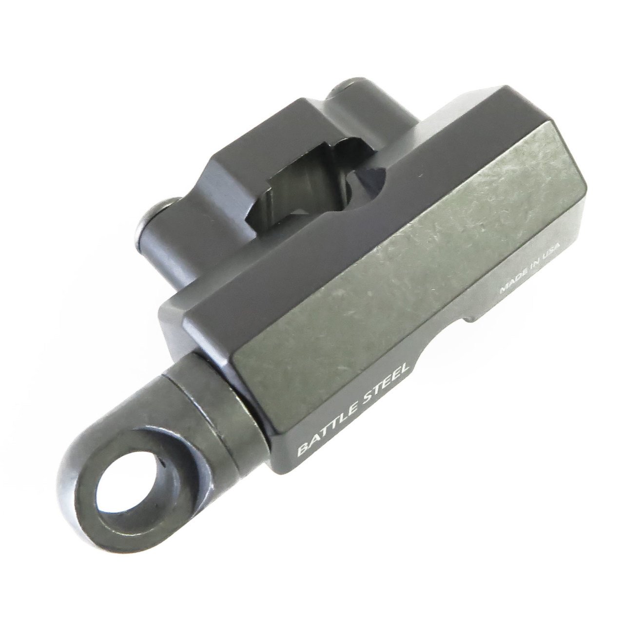 The new all new Battle Steel Front Sight Tower Combo mount uses a rugged two piece design to achieve a rock solid platform for Lights or Lasers and provides QD Sling mounting points on either side of the sight tower all in one package. The unique clamping system sandwiches the front sight tower between the light and sling mount. The Battle Steel Front Sight Combo Mount allows for adjustment vertically to accommodate weapons with suppressors, short barrels or oversize muzzle devices. The Battle Steel Front Sight Tower Combo Mount is designed to work with all conventional rail type Lights, Lasers and accessories. This small but feature packed mount is built to last a lifetime with all USA materials and workmanship.
