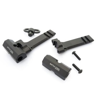 The new all new Battle Steel Front Sight Tower Combo mount uses a rugged two piece design to achieve a rock solid platform for Lights or Lasers and provides QD Sling mounting points on either side of the sight tower all in one package. The unique clamping system sandwiches the front sight tower between the light and sling mount. The Battle Steel Front Sight Combo Mount allows for adjustment vertically to accommodate weapons with suppressors, short barrels or oversize muzzle devices. The Battle Steel Front Sight Tower Combo Mount is designed to work with all conventional rail type Lights, Lasers and accessories. This small but feature packed mount is built to last a lifetime with all USA materials and workmanship.