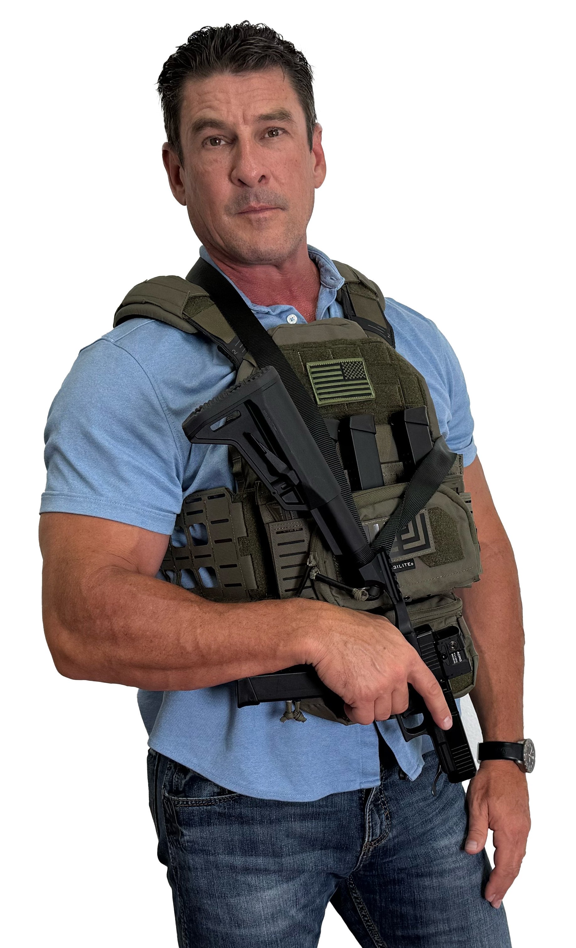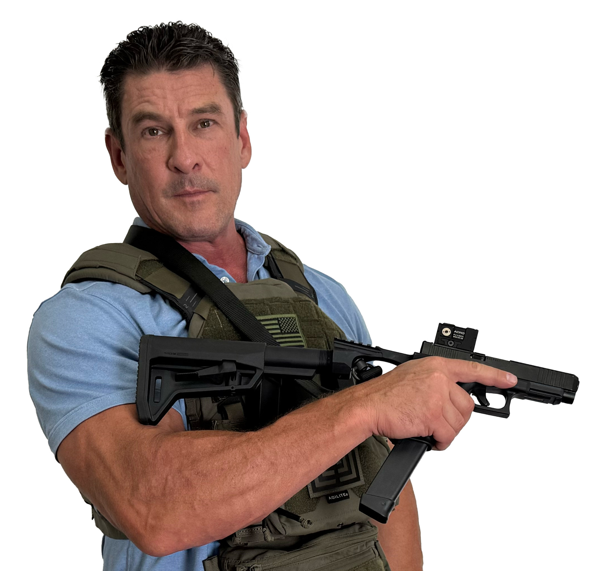 The BattleSteel "ARM" for Accuracy Recoil Management. What makes this product unique and extraordinary compared to other platforms on the market is that it does not interfere with the gun's use. This device attaches in seconds, using an enclosed pin, and can be permanently attached using an adhesive epoxy. The angle of the ARM allows the use of iron sights or red dots attached to the MOS system.