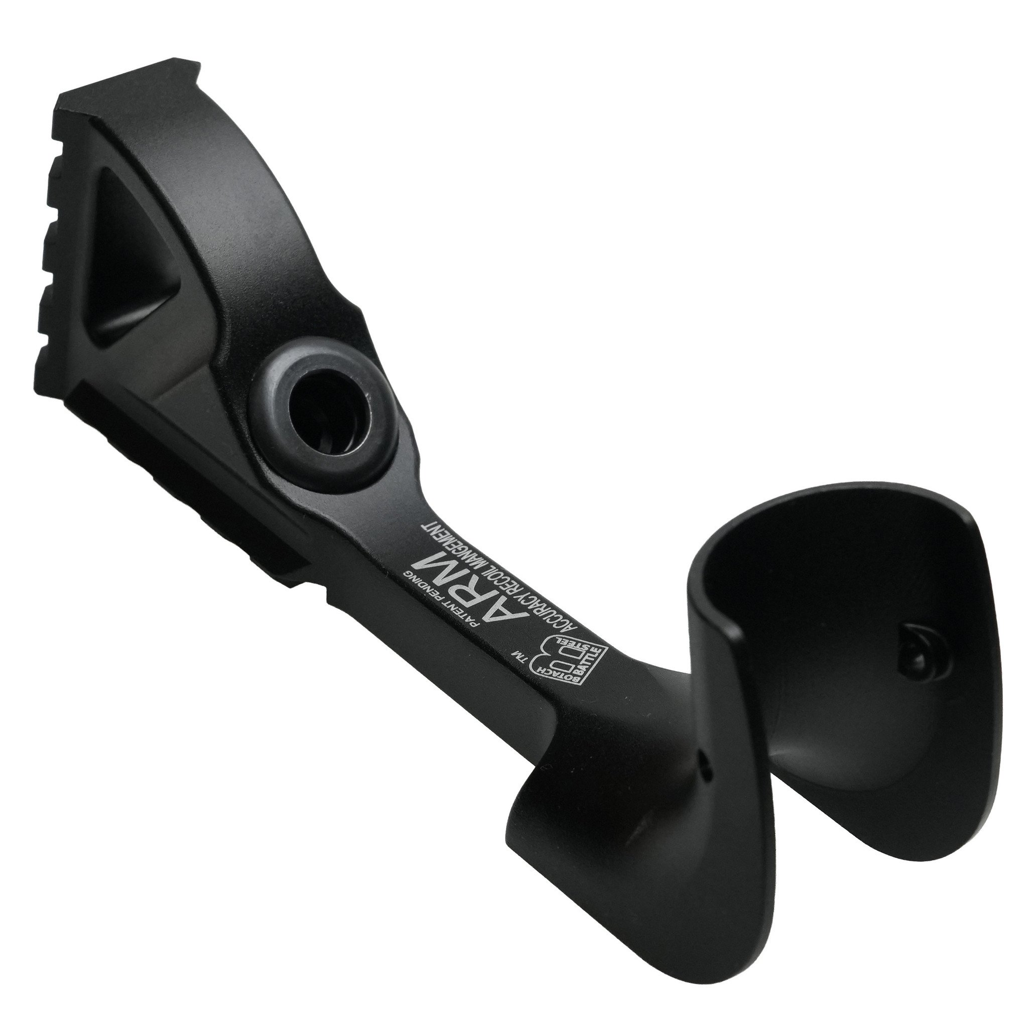 The BattleSteel "ARM-MR" for Accuracy Recoil Management. What makes this product unique and extraordinary compared to other platforms on the market is that it does not interfere with the gun's use. This device attaches in seconds, using an enclosed pin, and can be permanently attached using an adhesive epoxy. The angle of the ARM allows the use of iron sights or red dots attached to the MOS system.