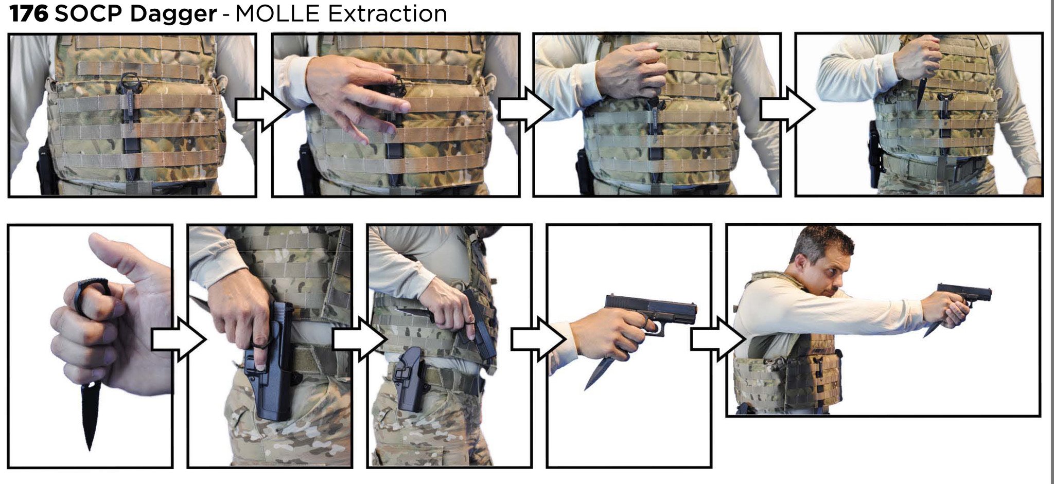 The SOCP Combo includes the SOCP dagger and a red trainer. The optimal tool for self-defense, allows the user to maintain dexterity and manipulate other objects without putting down the knife. The specialized sheath design also integrates into gear and webbing while keeping a low profile. MOLLE compatible.
