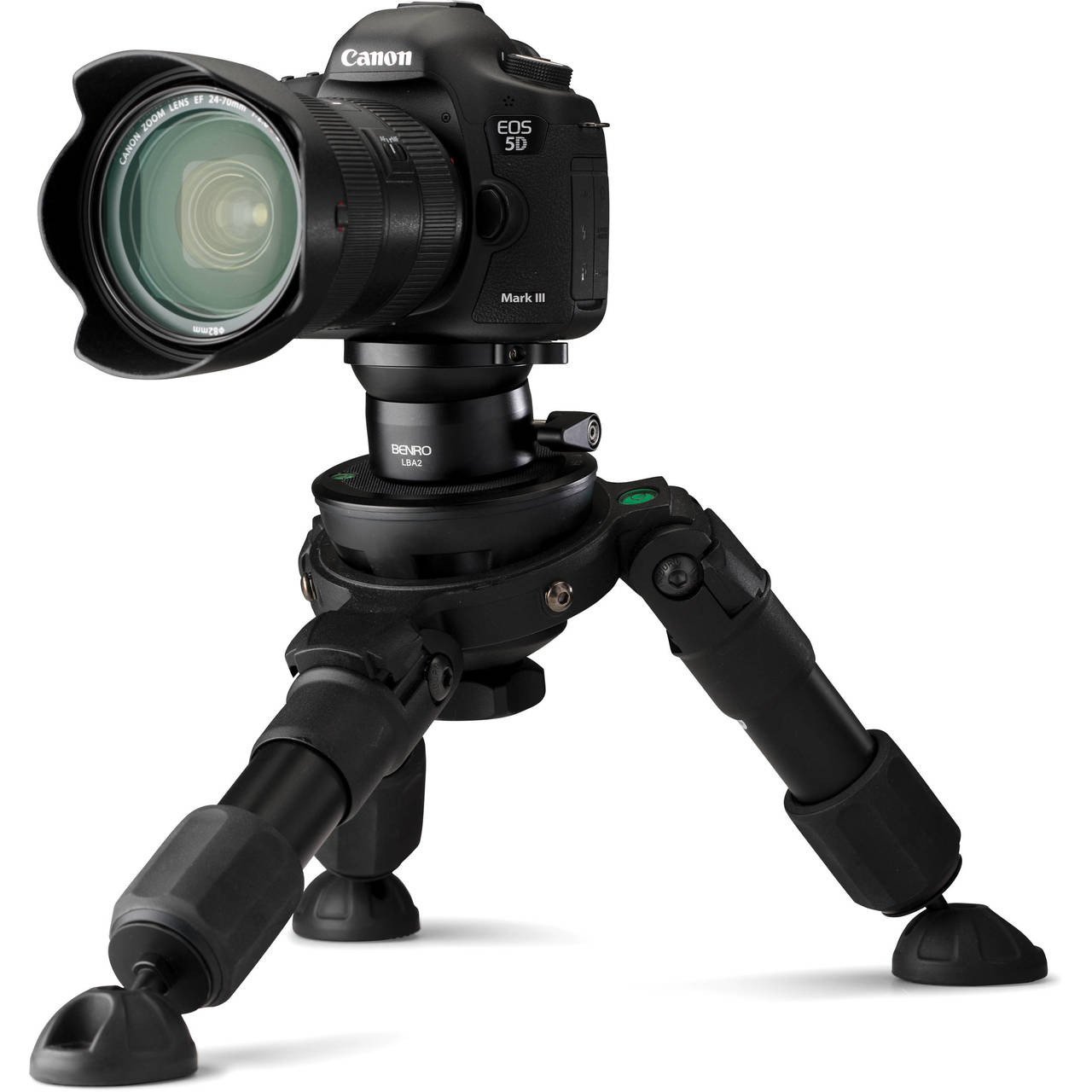 The Benro LBA2 Leveling Base is ideal for creating stitched panoramic images that require a level base for your pan head or ball head. It has a load capacity of 110 lb and can tilt +/-15° in any direction. The top of the leveling base has a spring-loaded 3/8"-16 threaded stud that can be recessed to reveal a 1/4"-20 stud, allowing you to mount a head or a camera directly to the leveling base. The bottom mount is a 3/8"-16 female thread with a 1/4"-20 bushing adapter.
