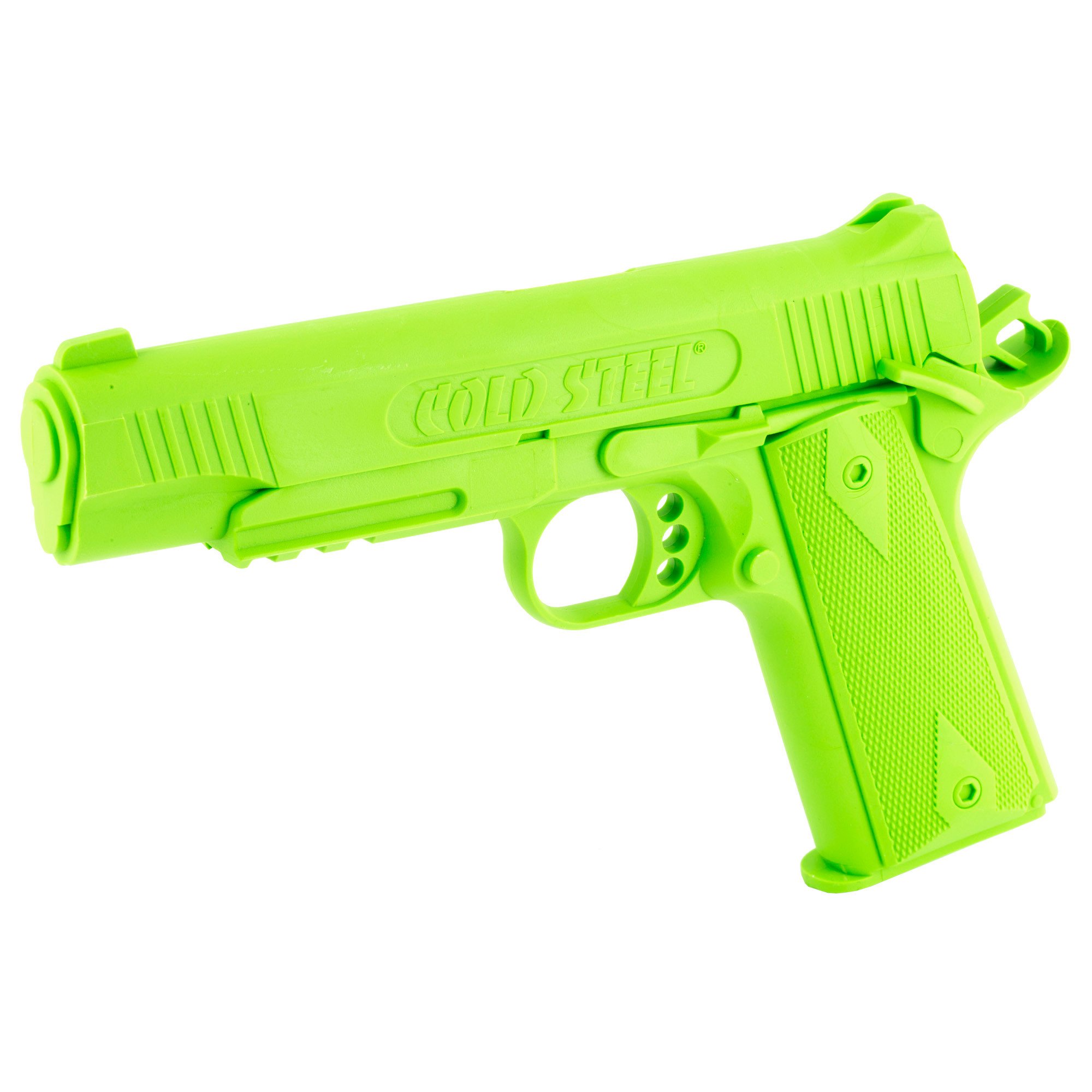 Cold Steel’s Training Guns 1911 Cocked & Locked are essential tools for Military, Law Enforcement, Personal Protection, Security Professionals, and Martial Artists alike. Crafted from ultra-durable thermoplastic rubber, these training firearms strike the perfect balance between rigidity for holster drawing drills and flexibility for safe hand-to-hand combat practice. Incredibly resilient yet cost-effective, they can withstand rigorous training sessions and can be purchased in bulk for large groups. Designed with vivid green polypropylene and made entirely in the USA, these training guns are replicas of popular firearms, ensuring they are distinctly recognized as training tools. Train smarter, train safer with Cold Steel.