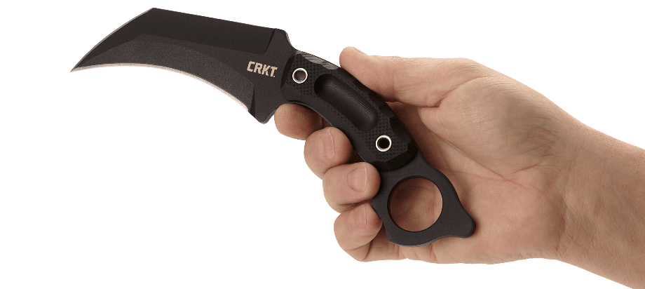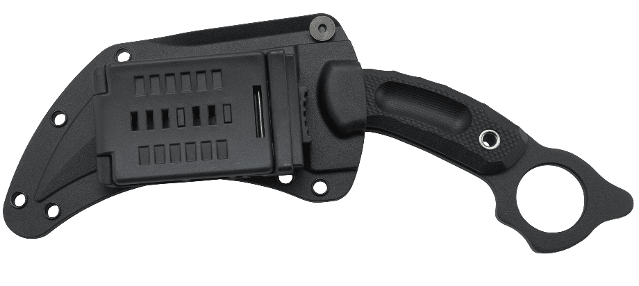 An ominous 5” carbon steel recurved blade—sharp on the nose and the belly—is a dependable companion in a self-defense situation. A thumb ring sits proudly atop the textured G10 handle for an unbreakable traditional karambit-style grip.With an intentionally-designed knife comes a secure, customizable sheath. Crafted of tough glass-reinforced nylon, ease of access and safety of draw is unmatched.