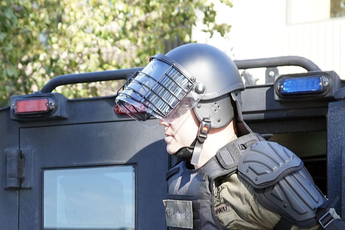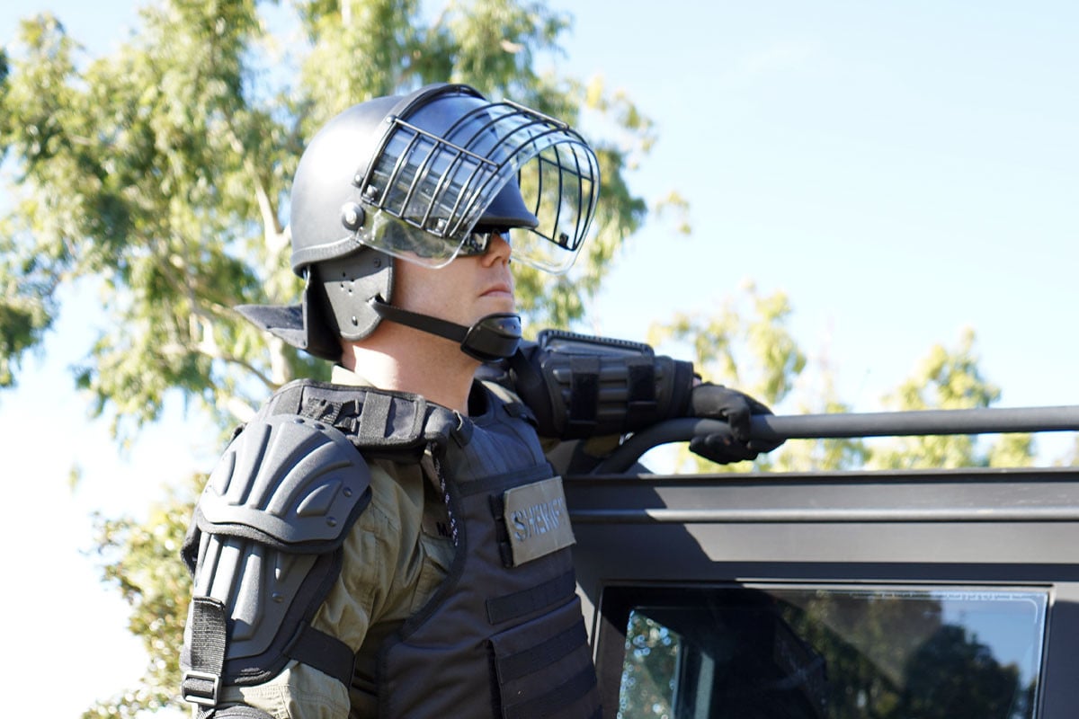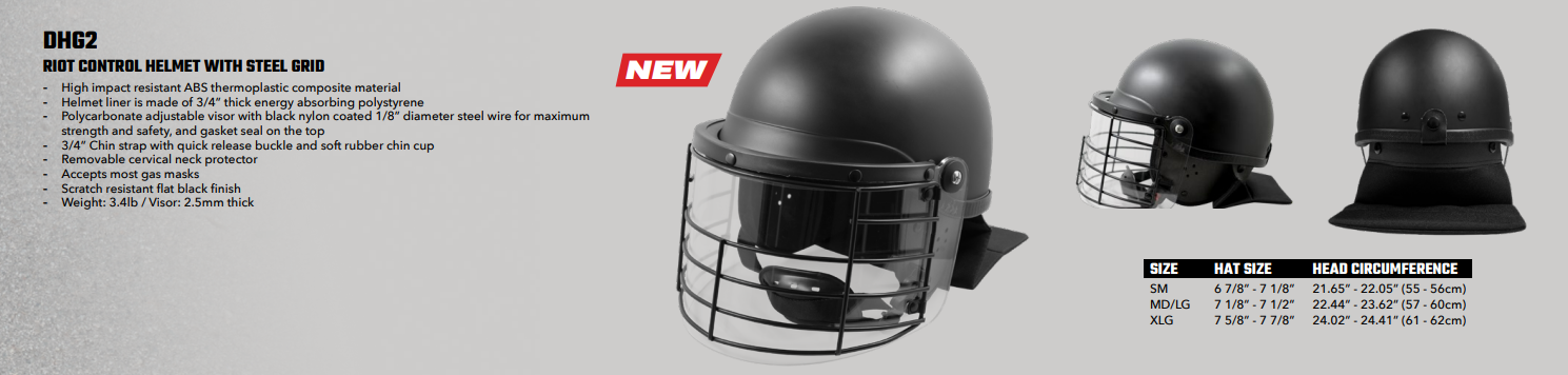 The Damascus Gear® Riot Control Helmet with Steel Grid features a high-impact ABS molded shell with neck protector and clear/polycarbonate tactical face shield that is gasket sealed. The face shield is reinforced with a metal grid. The helmet straps on with a quick-release retention system with chin cup. Provides full head and face protection against almost all NON-ballistic threats, such as chemicals, rocks, bottles and other projectiles.