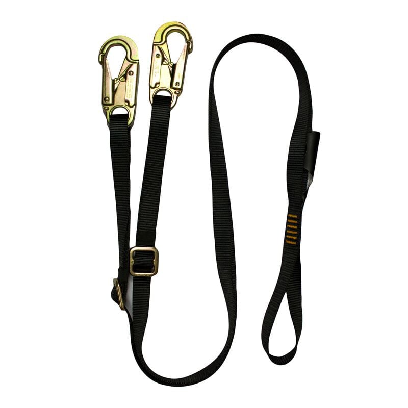 Y LEGGED LANYARD WITH HIGH STRENGTH DOUBLE LOCKING CARABINER 6FT - ADJUSTABLE . 1" Webbing rated more than 5000lbs. Designed specifically for safety and positioning for high rope courses