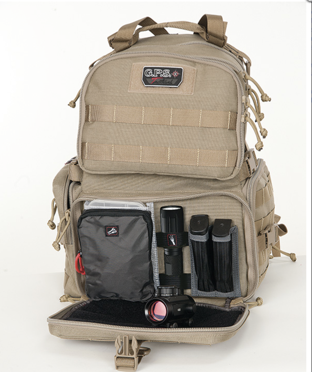 The Tactical Range Backpack is made of 1000 Denier heavy-duty material with DuPont Teflon coating, lockable YKK Brand oversized self-tracking zippers, triple-stitched MOLLE webbing, external bungee for targets, pull-out rain cover, 4 outside zippered pockets for ammo and other accessories as well as a padded waist strap for load stability and an internal honey comb frame for rigidity of the pack. Visual ID Storage areas provide velour-lining to protect glasses and ear pieces and aid in quick access of other items such as keys, cell phone or tools. The Tactical Range Backpack has 3 removable handgun storage cases with magazine storage and a hook and loop GPS Tactical logo patch, removable to personalize with a name or club placard.