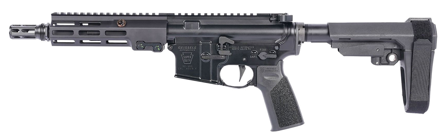 Geissele Automatics 08518B Super Duty Mod 1 300 Blackout 8" Black Threaded Barrel, Black Aluminum Receiver w/Picatinny Rail, Synthetic SB Tactical SBA3 Brace, Black A17 Grip