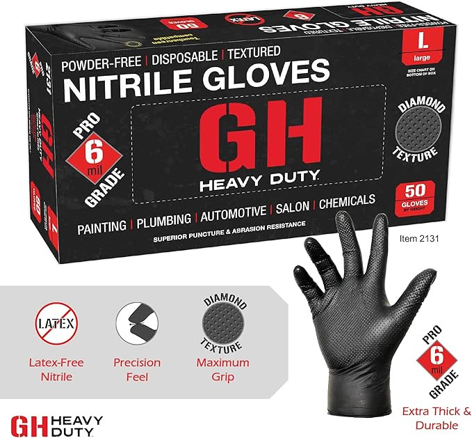 GH Heavy Duty Black Diamond Textured Nitrile Gloves, 100 Pack of 6 mil Disposable Gloves, Large
