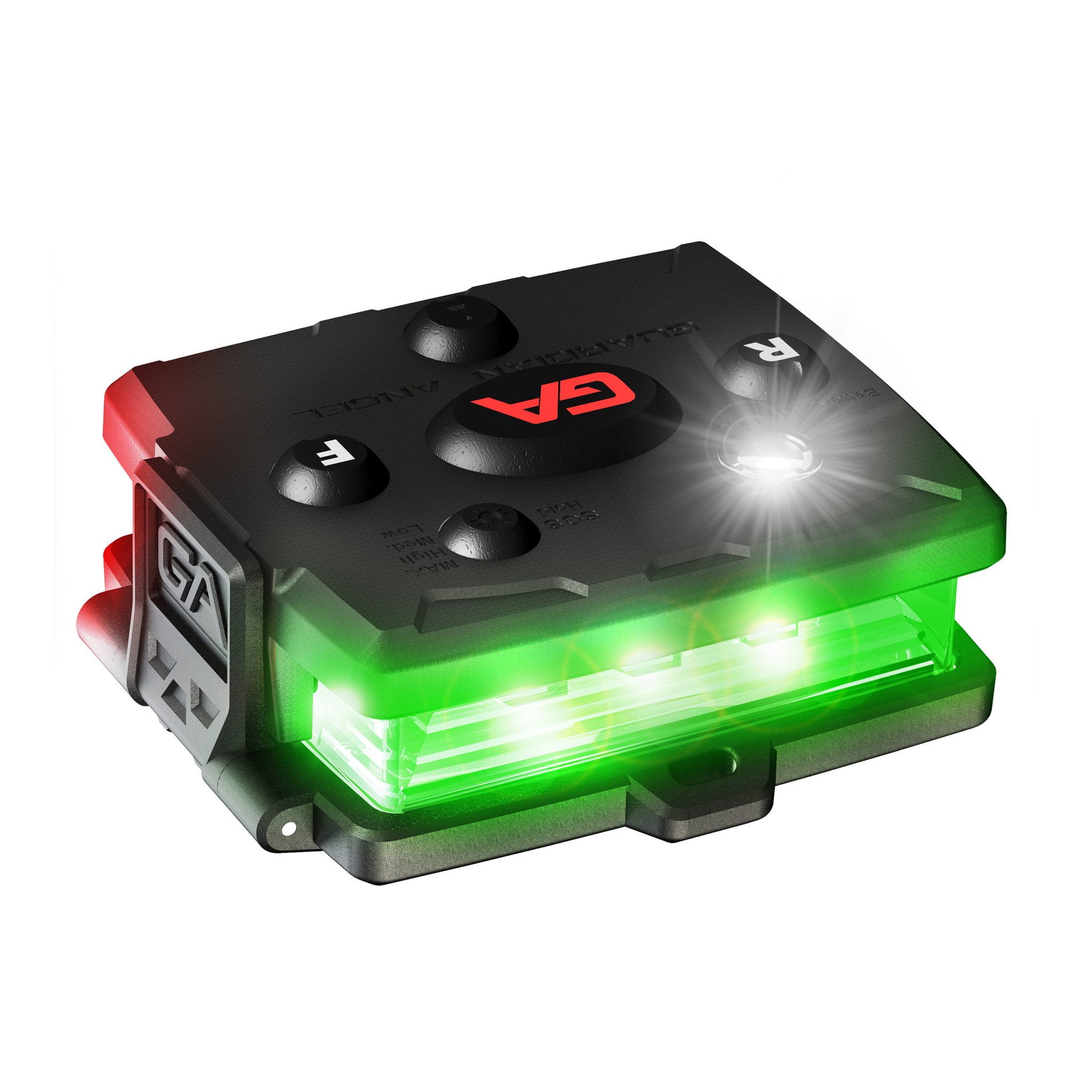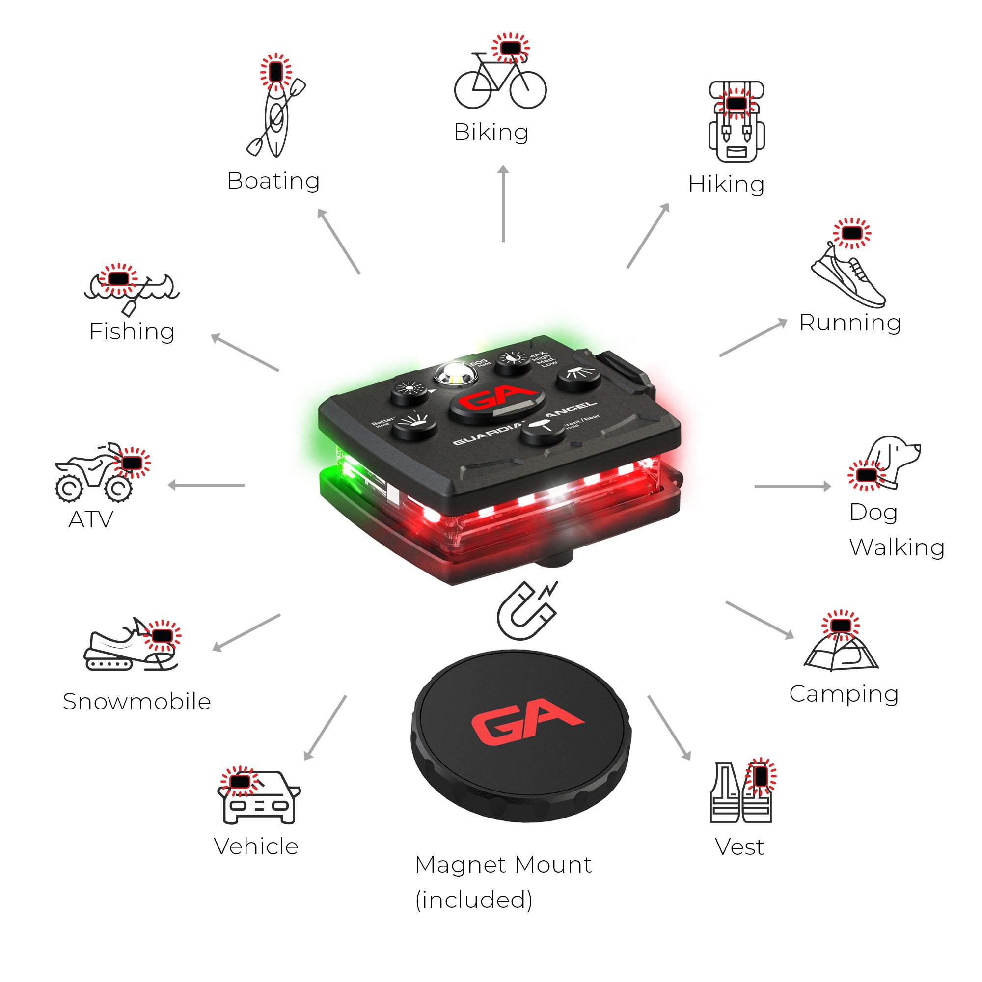 - Maximum Visibility: With 13 high-output LEDs, the Guardian Angel Micro Series keeps you visible from up to 3+ miles. With 360° lighting, others can see you from all sides. Four brightness settings, multiple flash patterns, steady burn option and Emergency Mode, ensure others can see you when needed. With 6 white LEDs on the front, 6 orange LEDs on the rear, this device features a hands-free white flood light, a white work light, and a white top light.