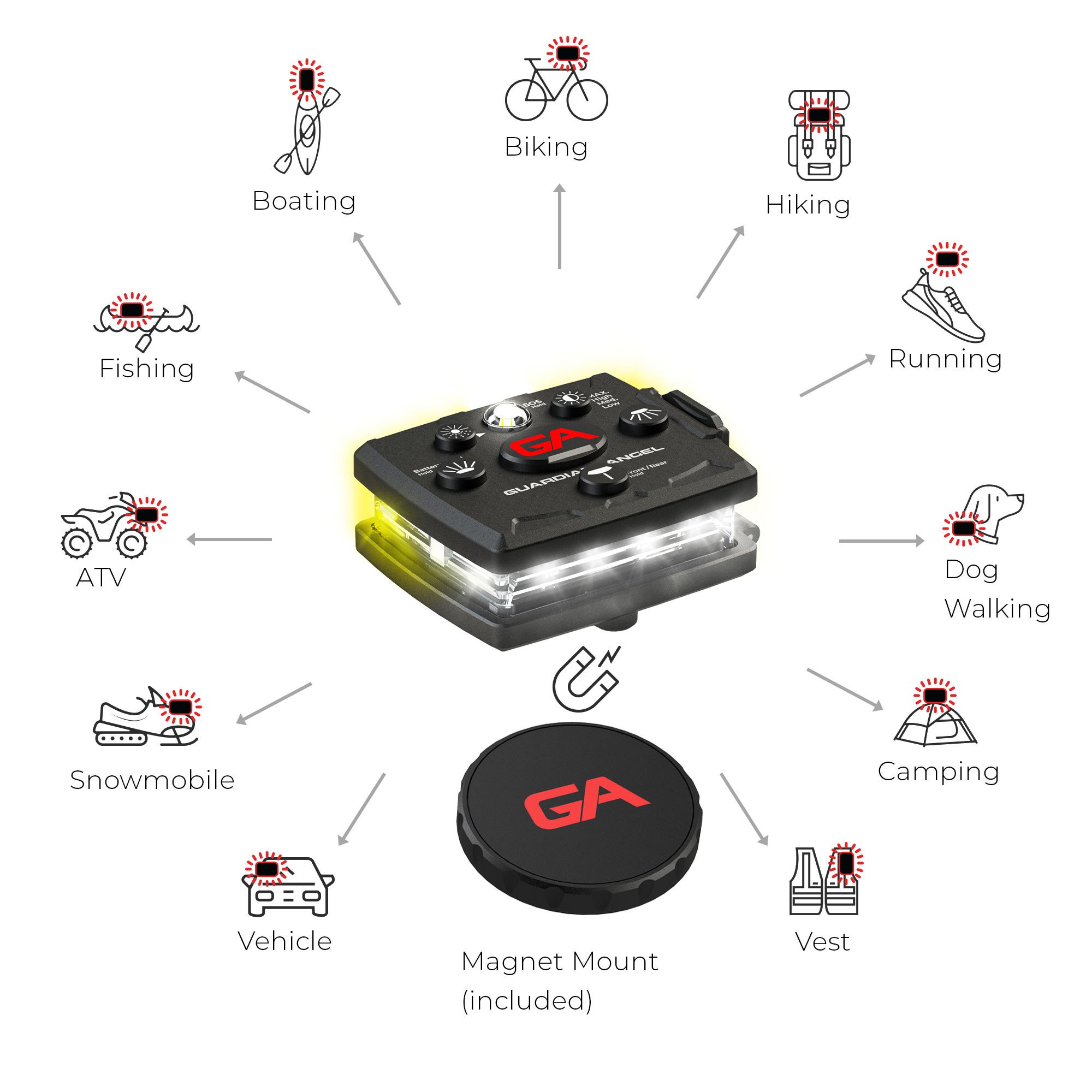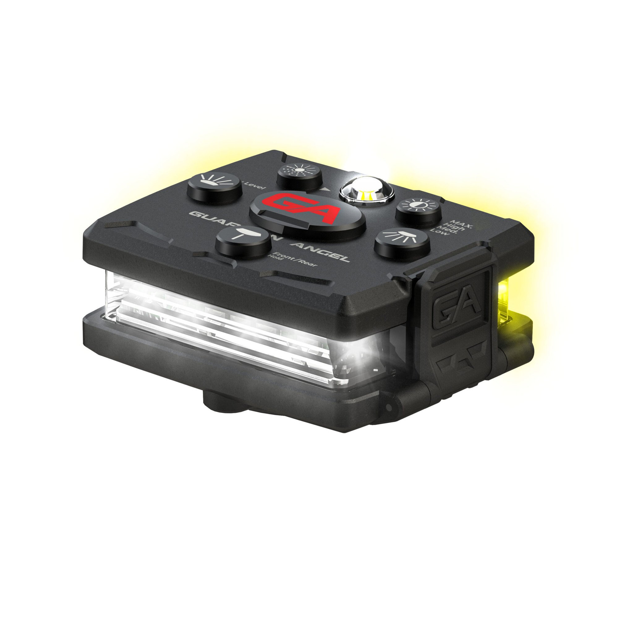 Maximum Visibility: With 13 high-output LEDs, the Guardian Angel Micro Series keeps you visible from up to 3+ miles. With 360° lighting, others can see you from all sides. Four brightness settings, multiple flash patterns, steady burn option and Emergency Mode, ensure others can see you when needed. With 6 white LEDs on the front, 6 orange LEDs on the rear, this device features a hands-free white flood light, a white work light, and a white top light.