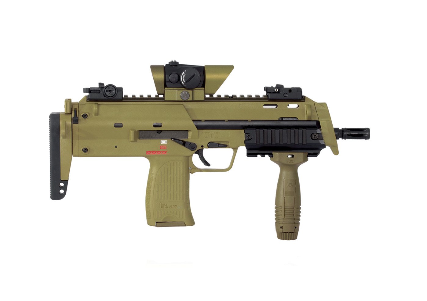 Optional forearm rails are also available. Standard folding mechanical peep sights can be fitted to the top rail or optional reflex, holographic, and other advanced sights can be attached in seconds without tools. Advanced optics like reflex (red dot sights) and holographic sights make aiming and target acquisition easy and intuitive whether the weapon is fired from the shoulder or at arms length like a handgun. Special carrying devices are available for overt and discreet carry of the MP7A1. Due to its lightweight, small size and minimal width the MP7A1 is especially suitable for VIP protection details, pilots, drivers, guards, and support personnel who require hands-free carry of their defensive weapon while performing other tasks. The most recent MP7 variant, the MP7A2, has a new style Picatinny Triple Rail handguard (3, 6, and 9 o’clock position) for the attachment of a forward vertical grip and other accessories.