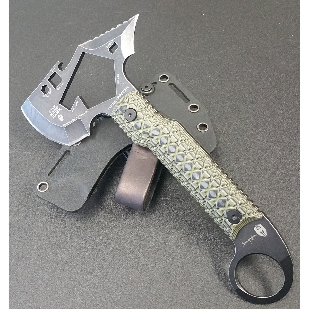 The Hoffner Hand Hawk is a versatile and unique tool that combines the functionality of a tomahawk, pick, gas valve cutoff, emergency de-con valve, o2 valve, and even a beverage opener all in one compact design. Made in the USA with 440 Chromium Stainless Super Steel, this mini tomahawk is built to last with a 56-58 HRC Rockwell hardness. The acid wash, stonewash finish gives it a sleek and rugged look, while the G10 handles in Dark Ops provide a comfortable and secure grip. Whether you need a first responder/rescue tool or a survival axe, the Hand Hawk is the perfect companion that you won't want to be without. The Kydex sheath with belt latch allows you to wear it comfortably on your belt with the handle up or down, and the ambidextrous belt mount ensures easy accessibility no matter which hand you use. Get your hands on the Hoffner Hand Hawk today and experience the convenience and quality of this innovative tool.