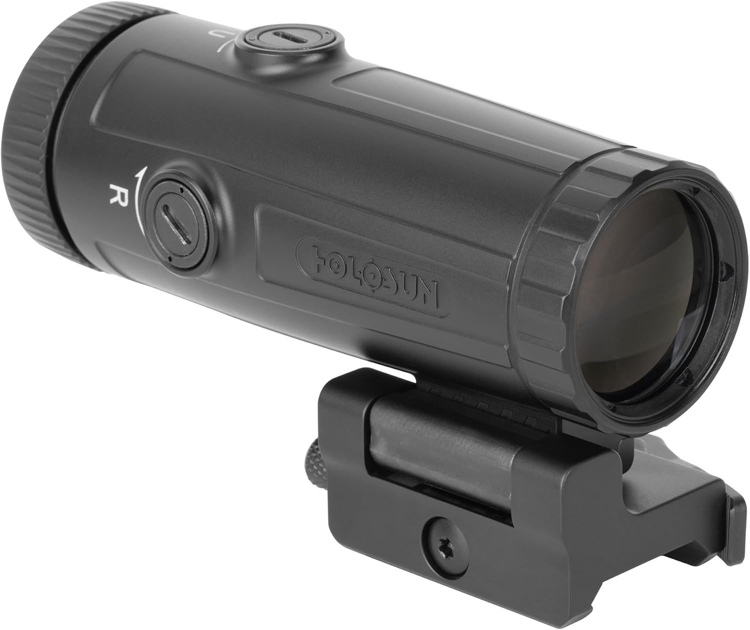 Flip this Holosun HM6X 6x Magnifier into position for a magnified view of the sight picture through your red dot sight. When your target is closer, the magnifier flips aside easily. Elevation and windage adjustments allow you to stay perfectly synced with the sight. You'll have 2.55" of eye relief and the magnifier comes with a riser for lower 1/3 co-witness. Equipped with a quick release Picatinny mount, the HM6X is made from 7075 aluminum and rated IP67 waterproof.