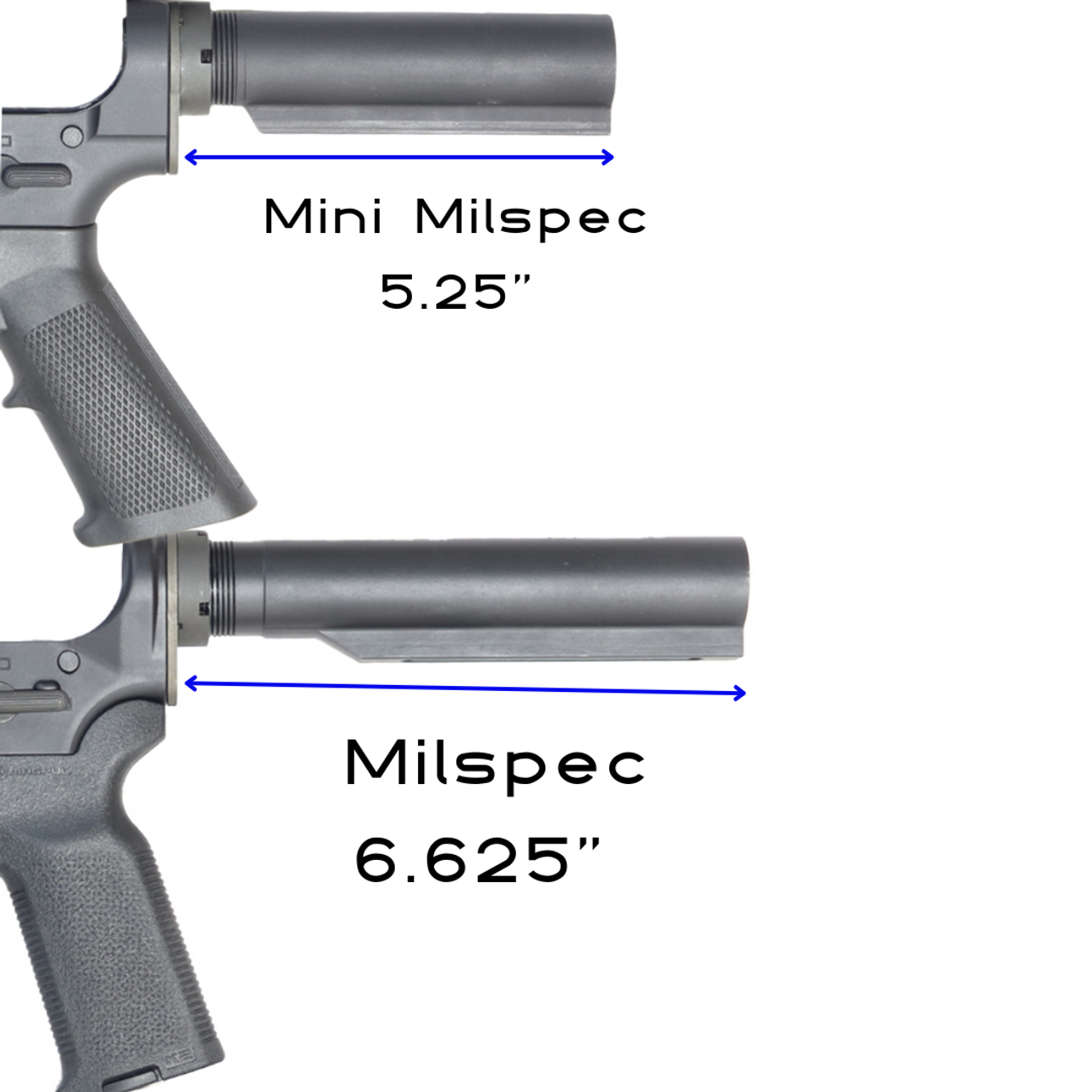 When installed, the M4 stock is taken down from just over 6.5" to 5", and the Mini Buffer Tube is only 5.25" long from the receiver's end. The Mini Milspec M4 Stock can collapse completely flush in the last adjustment hole on the buffer tube, making the stock's front flush with the castle nut. Mini Milspec Buffer Tube with Mini M4 Stock Installed, collapsed configuration- 5 5/8” from back of the receiver. Normal Milspec M4 stock with six position buffer tube- 7 1/8”. Magpul SL-M will collapse flush with the castle nut in the 2nd adjustment slot, .5" longer than KAK Mini M4 Stock. The Proprietary Mini 5 Position Buffer Tube extends only 5.25" from the rear of the receiver. The buffer is designed to accept Milspec parts, a term used to describe parts that meet military specifications, ensuring high quality and compatibility. It also accepts a variety of stocks, making it a versatile choice for your firearm setup.