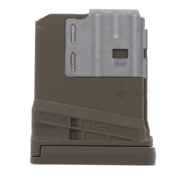 The Lancer L7AWM 7.62mm & 6.5CM 10-Round Magazine FDE is a durable and reliable magazine designed for maximum performance. Its integrated front guard and welded steel feed lip ensure stiffness and prevent dimpling while the switchable drain in the floor plate lock allows for customization in various conditions. Compatible with multiple weapon systems, including SR25 and DPMS 308, this magazine features an impact-resistant polymer body, stainless front guard, rear feed lip, and a stainless steel spring. Its aggressive texture improves gripping, making it easy to retrieve from pouches. Made in the USA, the L7AWM is a must-have for any serious shooter.