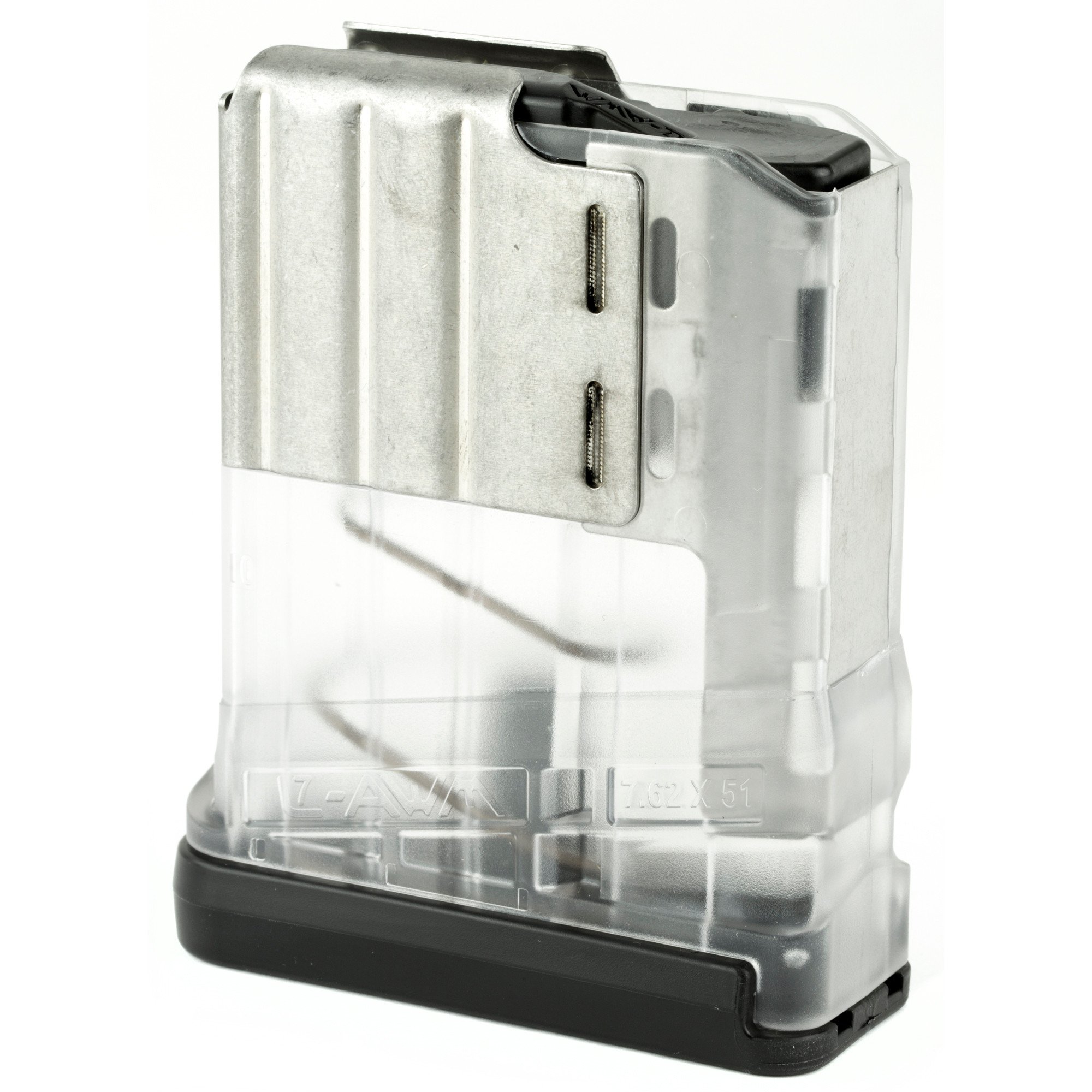 The Lancer L7AWM 7.62mm & 6.5CM 10-Round Magazine Translucent Clear is designed for maximum durability and reliability. With a lightweight yet sturdy polymer body, integrated front guard, and welded steel feed lip, this magazine prevents dimpling while providing a stable platform for feeding. The switchable drain in the floor plate lock allows for customization based on environmental conditions. Compatible with various weapon systems, this magazine features stainless components and a controlled tilt follower for smooth feeding. Made in the USA, the L7AWM also boasts aggressive texture for easy gripping and retrieval. Perfect for high-volume shooting, this magazine is a top choice for discerning shooters.