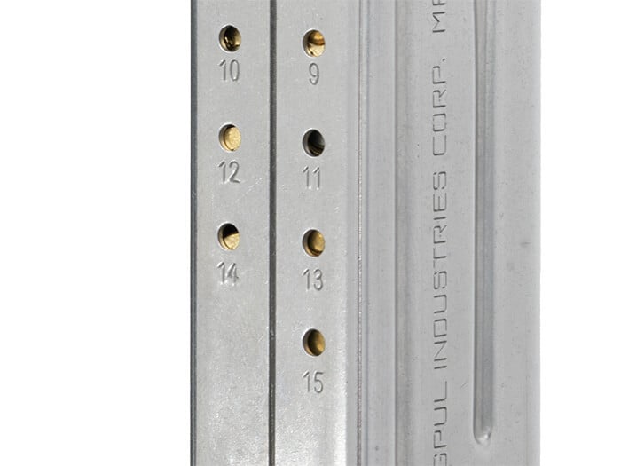 The MAGPUL AMAG 15 SG9 is a robust 15-round 9mm magazine made specifically for SIG P320 Compact frame handguns. Built with a stainless-steel body and durable polymer components, this magazine ensures reliable performance under demanding conditions. It features a high-visibility, controlled-tilt follower for consistent, precise feeding and a corrosion-resistant stainless-steel spring that maintains optimal tension through repeated use. The flared floorplate adds durability and is easily removable for cleaning and maintenance. Capacity indicator windows run along the spine in one-round increments starting at five rounds, and a paint-pen dot matrix allows for easy custom identification. Proudly made in the USA.