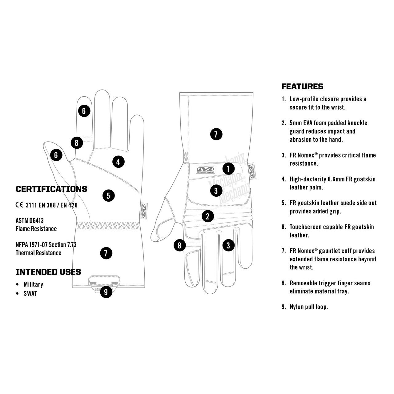 - High-dexterity 0.6mm FR goatskin leather palm.