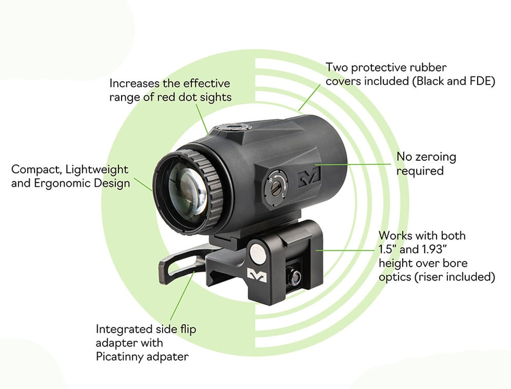 Enhance your shooting experience with the Meprolight MMX4 4X Power Magnifier. This compact and lightweight magnifier, weighing just 6.9 oz, extends the effective range of your red dot or reflex sight without adding bulk. Precision elevation and windage dials ensure seamless field of view alignment, while the wide FOV allows for swift target acquisition with both eyes open. Designed for agility, the MMX4 easily attaches to MIL-STD-1913 rails and can be conveniently flipped away when not in use. With no zeroing required and rugged, waterproof construction, this magnifier is perfect for fast-paced environments. Durable, versatile, and reliable, it's the ideal addition to your firearm setup.