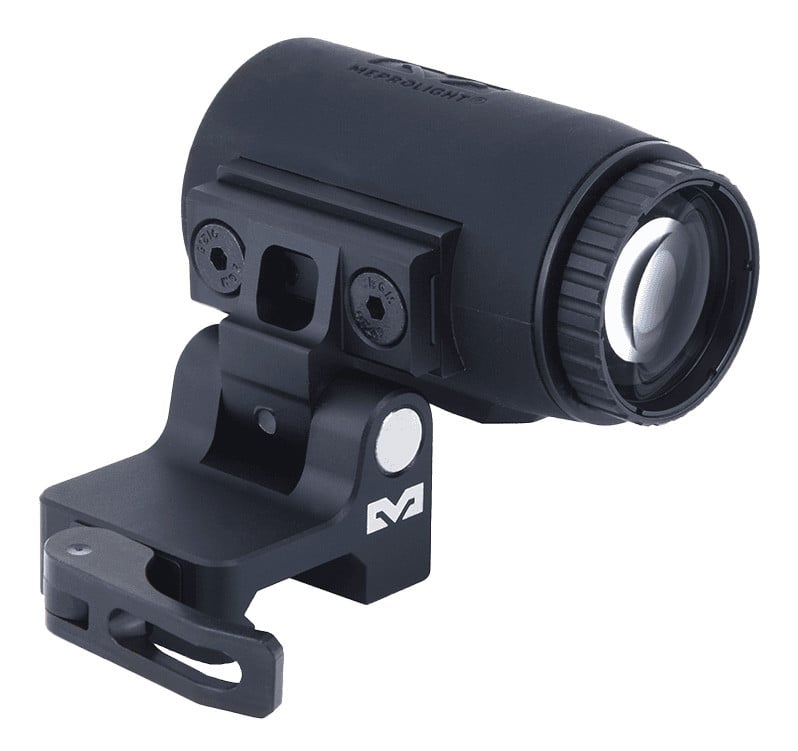 The Mepro MMX4 and micro magnifiers are compact, lightweight magnifiers that will extend your effective range of your red dot or 1x reflex sight. Weighing in at 6.9 oz. respectively they reduce the footprint, saving rail space and weight on your firearm. Elevation and windage dials provide precise FOV line of sight alignment. A wide FOV enables rapid target acquisition with both eyes open which is ideal where agility, and speed are of the utmost importance. The Mepro MMX4 and micro magnifiers attach to any MIL-STD-1913 rail directly behind your optic. When not in use the Mepro MMX4 can be “flipped” out of the way by depressing a pushbutton.