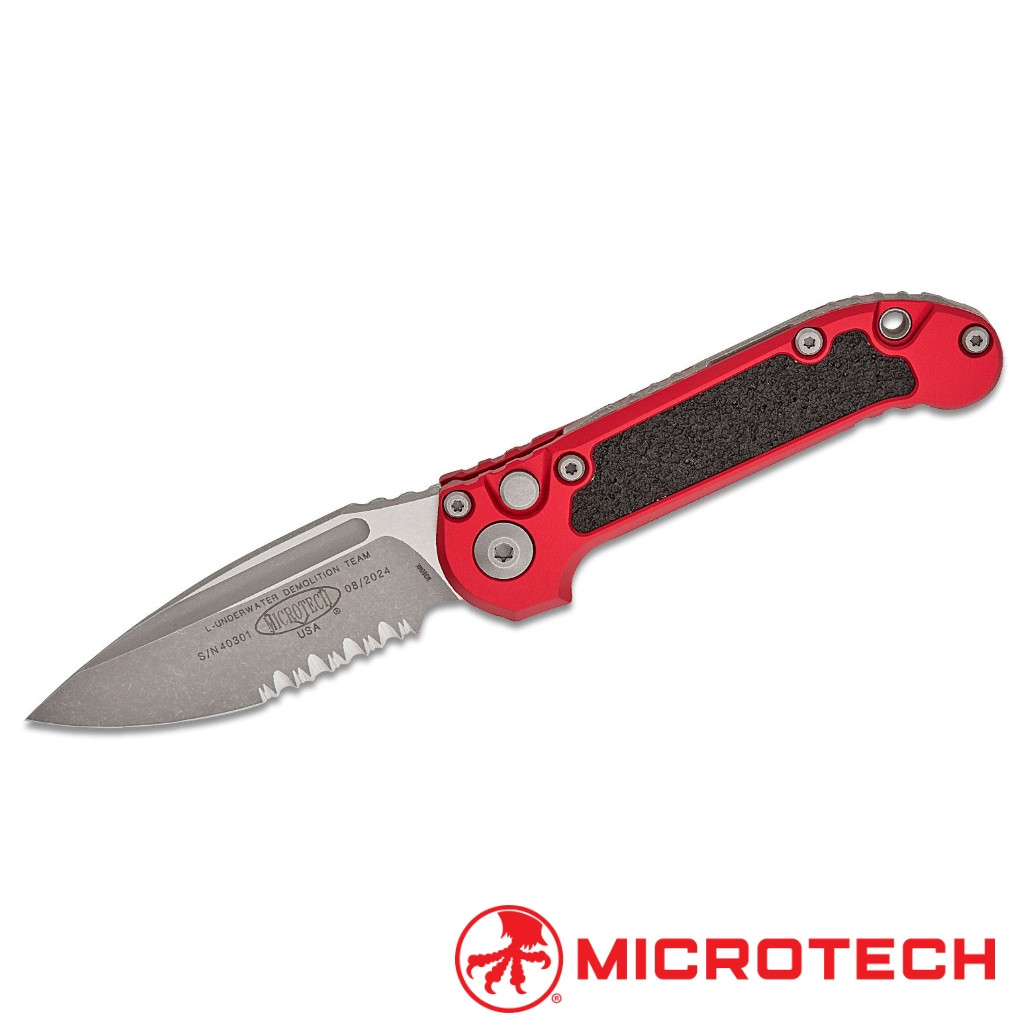 View productMicrotech LUDT Gen III Automatic Folding Knife Red/grip Tape Inlay 3.4" Drop Point Apocalyptic Stonewash Serrated #1135-11aprd$269.00
