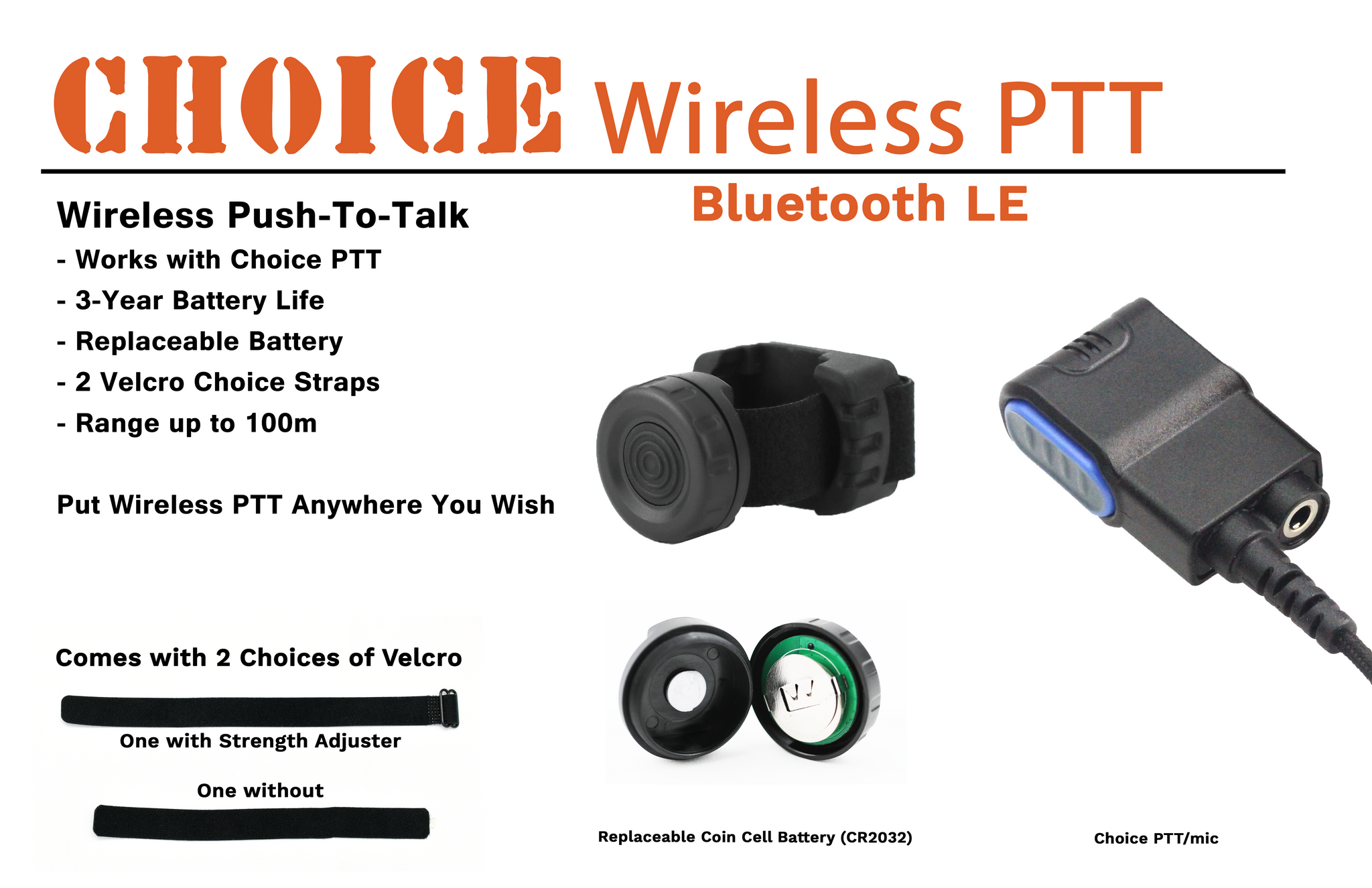 The CHOICE™ PTT/mic. (Tier 2) is IP65 and is Wireless PTT Capable, and compatible with our Bluetooth Wireless PTT (Push-To-Talk). Users love the flexibility of a second PTT on a steering wheel, handlebars, vest molle straps, belt loops, or guns. The Wireless PTT works independently from the CHOICE™ wired PTT. Replaceable coin cell battery and stays charged for months.