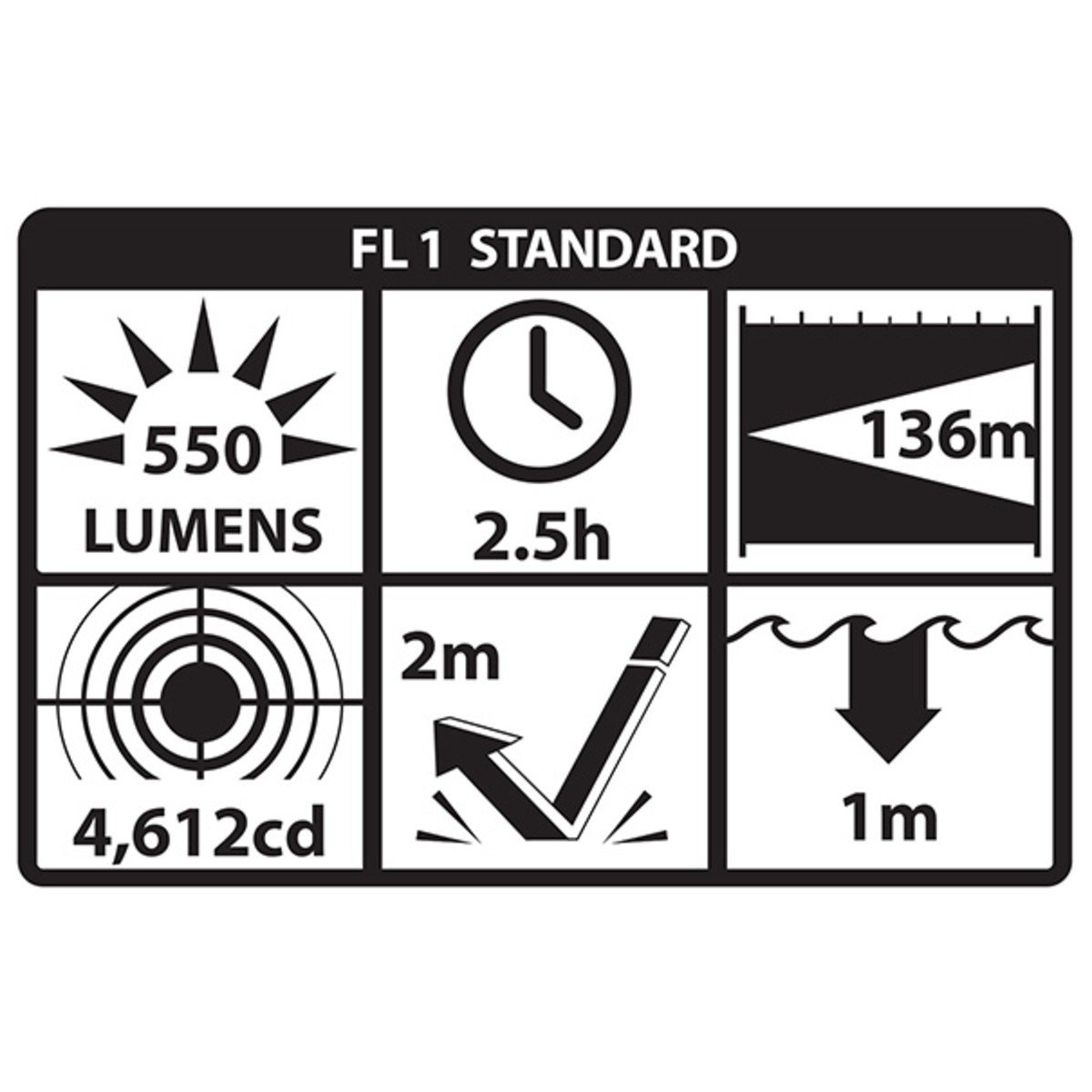 The TCM-550XL Compact Tactical Weapon-Mounted Light uses a super-bright LED rated at 550 lumens working in conjunction with a precision-engineered total internal reflection (TIR) lens to create a bright white beam of light rated at 136 meters. This weapon light features completely ambidextrous and intuitive rear-facing toggle switches on each side of the light to operate the momentary-on and constant-on lighting modes. The housing of the TCM-550XL is constructed from aircraft-grade 6061-T6 Aluminum with a polymer rear housing. Includes four handgun-specific modular rail inserts (pre-configured with C1 insert for Glock pistols), two spare Allen screws, Allen wrench, and one CR123 Lithium battery.
