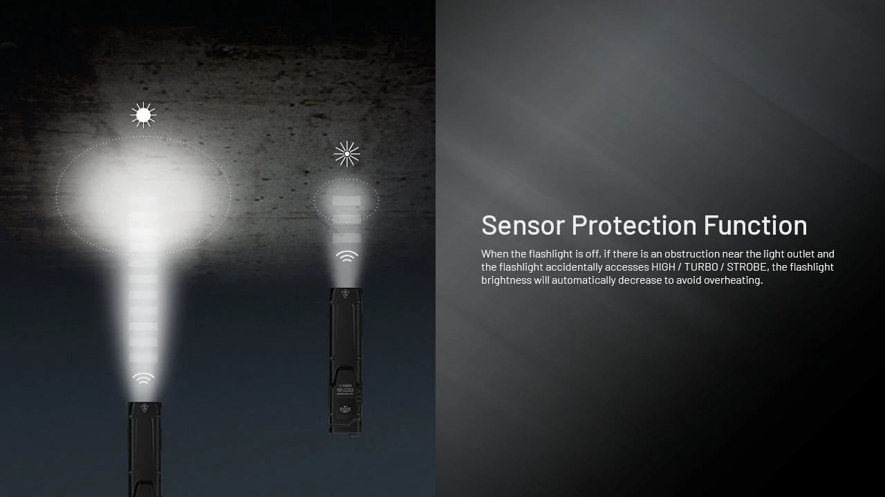 To power the light on or off, simply fully press the Power Button. While the light is on, half-press the power button to cycle through four different brightness levels, all conveniently indicated by the OLED screen. When turned off, the EDC27 UHi will remember the previously selected brightness level when reactivated. To quickly cycle between brightness settings, use the Level Preset Function to find your desired output. To access the Ultralow mode, half-press the power button when the light is off. To access Turbo, half-press the mode button. Full press the mode button to activate Strobe. The EDC27 UHi features an updated Sensor Protection function that activates when the light is accidentally turned on in High, Turbo, or Strobe modes, automatically reducing the brightness to prevent overheating. This sensor protection is only active when the light is turned on and deactivates during normal use.
