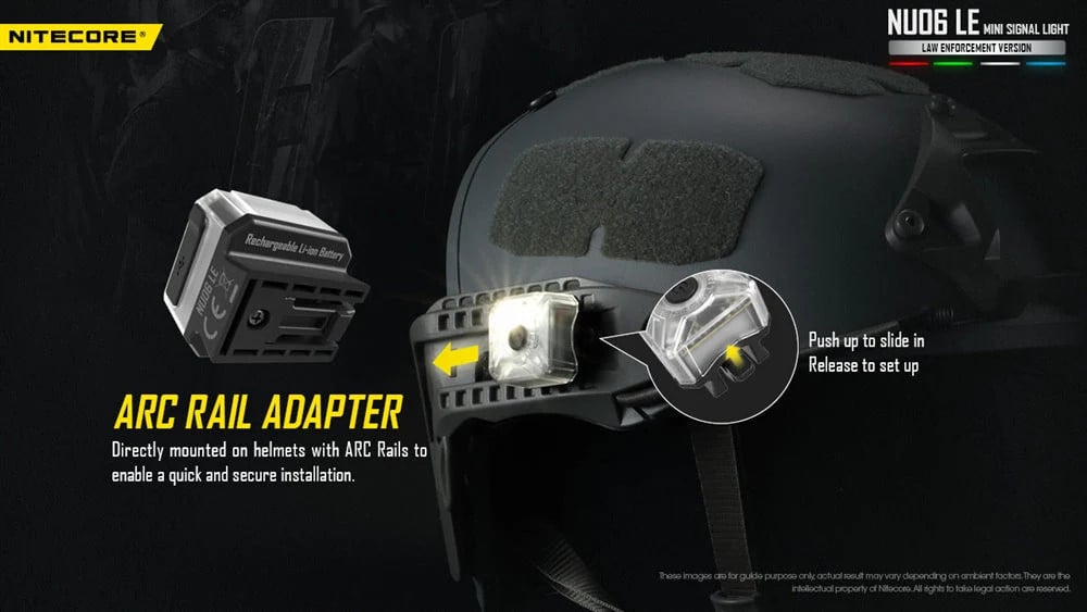 3 Lightweight Brackets for Versatility The NU06 LE on its own is ARC rail compatible yet still comes with 3 lightweight brackets: a flat magnetic bracket for metal surfaces, a curved bracket for hook-and-loop surfaces, and a four way MOLLE system bracket. Now the NU06 LE is capable of being attached to literally every surface, from bags, helmets, hook-and-loop patches, MOLLE systems on vests and armour, and anywhere else you can think of.