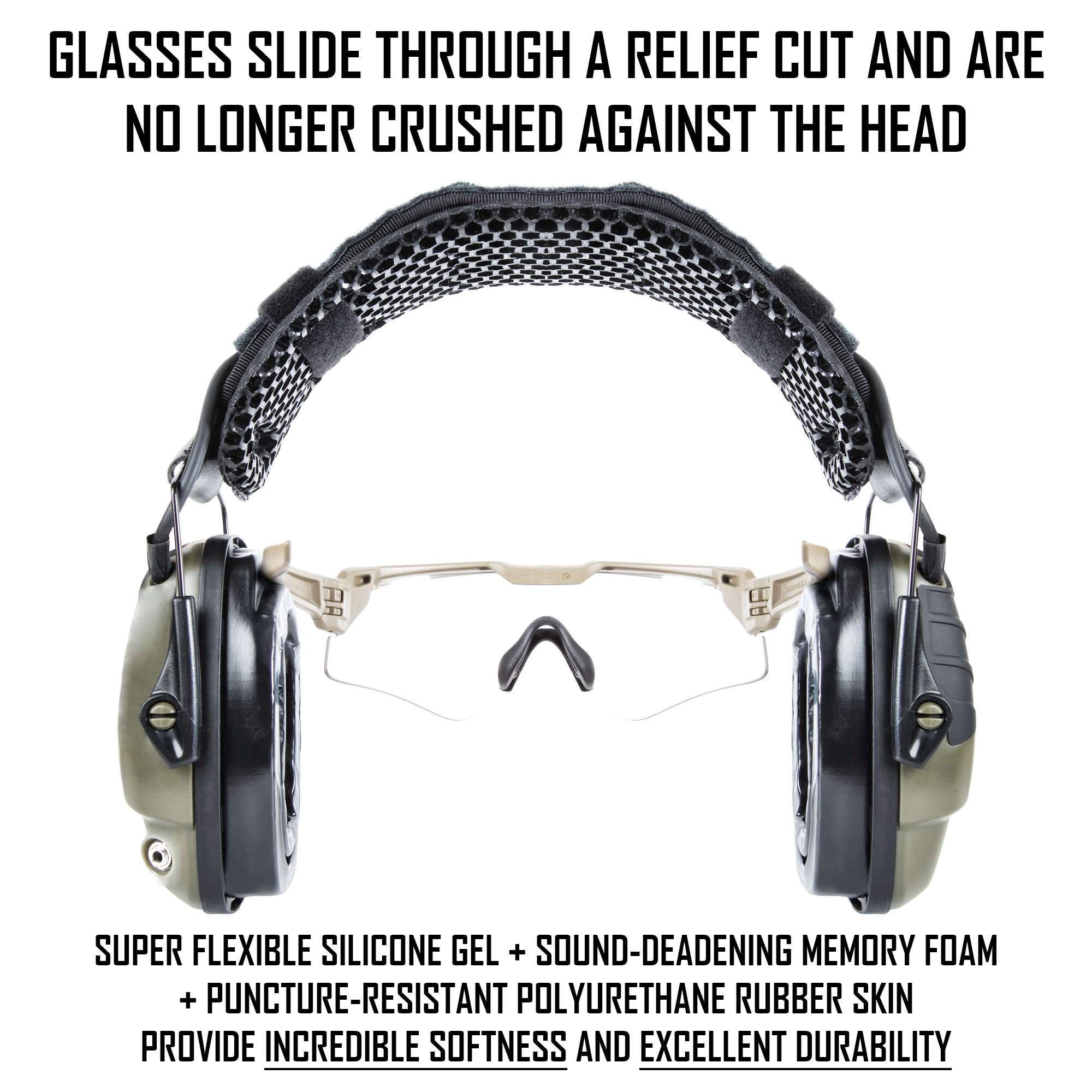 Best results with straight-style glasses arms, and our super-soft and flexible silicone gel produces an amazing seal with other types of glasses arms. Our unique horseshoe-ring shaped, grooved front face and 1/4" inch of silicone gel provide significantly better softness and sealing vs. competitors' pads. When headset is lowered as much as possible, glasses arms can be dropped into relief cuts and will sit in a protected channel just above the ear. Using the relief cuts is completely optional. Our gel pads work like normal pads when glasses are not in use. Use of super-premium acoustic memory foam and allowing for a closed head seal leads to impressively better sound deadening.