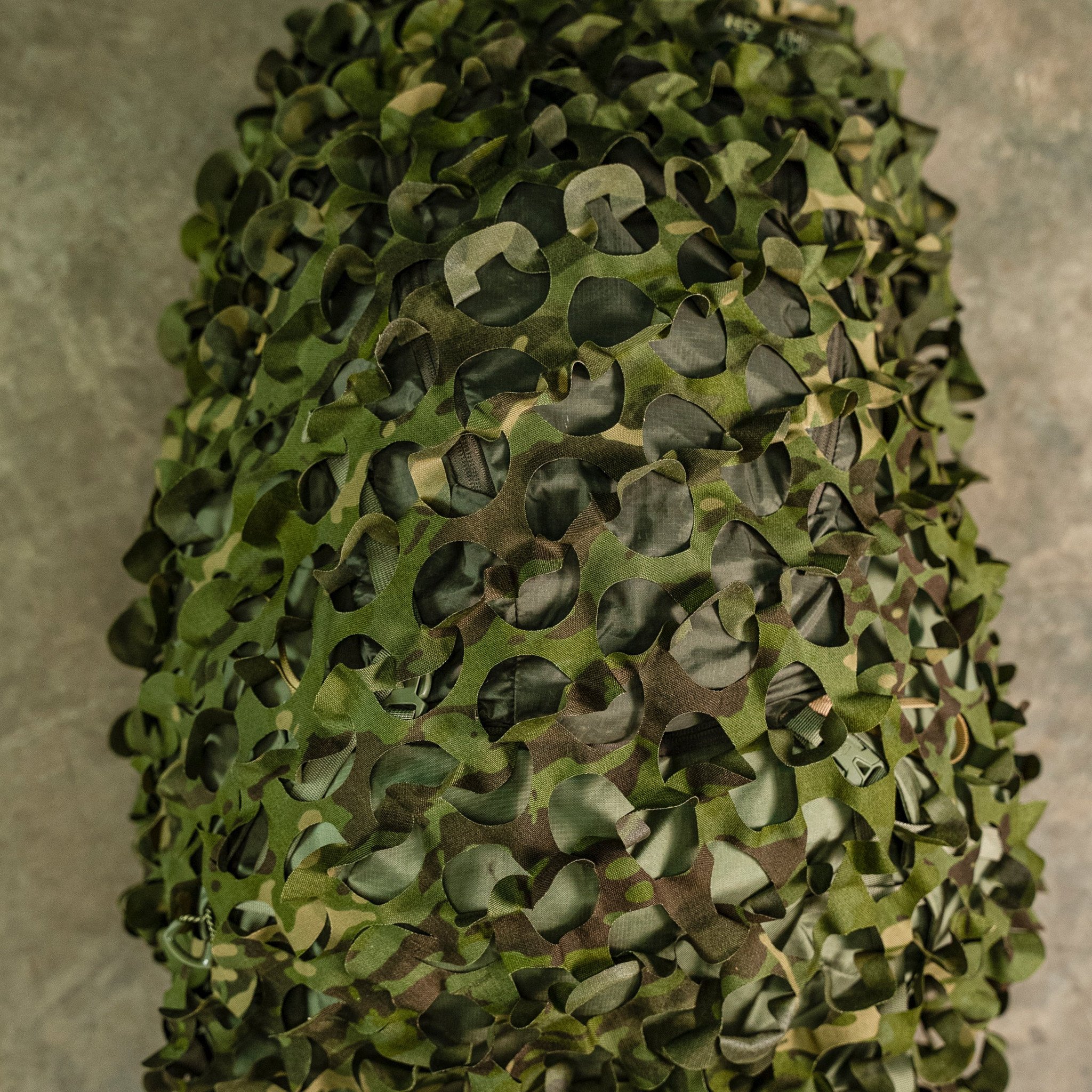 As the durable 500D fabric expands, its mesh opens, breaking up the silhouette of your backpack or rucksack. It attaches via a simple, adjustable shock cord that is stretched over your pack and can be removed as quickly as it is installed. Once removed, it can be used as a versatile camouflage netting for an observation post, hide site, etc.