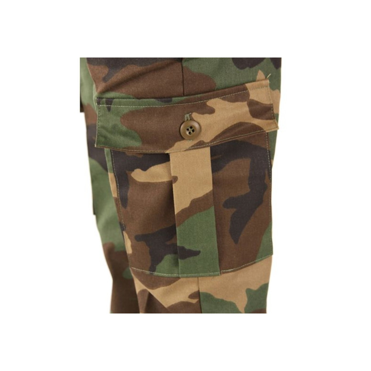 Propper's BDU Trousers for Kids features a zip fly, quarter top front pockets, 2 button-through cargo pockets, 2 button-through back patch pockets, adjustable waist tabs, fused, knotted and tacked nylon leg drawstrings, and single needle pocket stiching.
