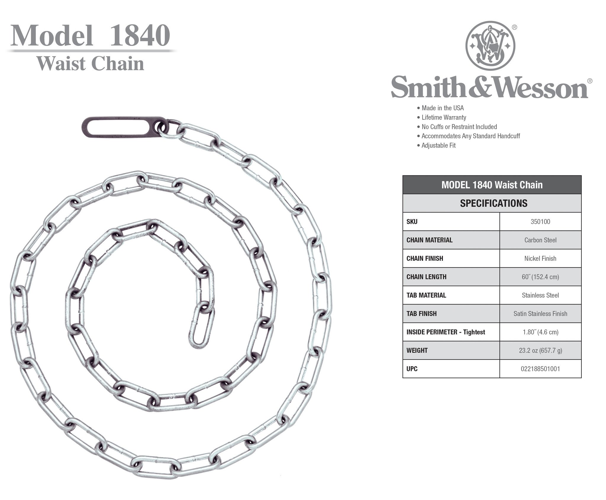 Smith & Wesson Model 1840 Chain Restraint Belt with 60" steel chain and large steel link that accommodates standard and oversized handcuffs. Restraint chain can be used with a Blue or black box with a padlock, or insert link through one of the chain links to create an instant, secure belly chain. This item is not compatible with the CTS7083 blue box #2. Weighs 22 ounces.