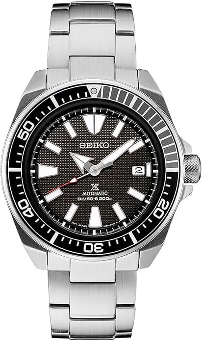 Prospex Automatic Diver. Designed for those who treat life as the ultimate adventure, the Seiko Prospex line meets every challenge with technological excellence and winning design. Inspired by Seiko’s most iconic diving styles, this distinctive diver’s watch features a 3-D pressed patterned black dial with red accented second hand. For reliable timing in rough waters, the 23-jewel automatic movement beats at a frequency of 21,600 vibrations per hour, with a power reserve of approximately 41 hours, and can be wound manually or automatically. With a date calendar and LumiBrite hands and markers, the dial is framed by a black uni-directional rotating elapsed timing bezel. This high-intensity timepiece, in stainless steel, with secure screwdown crown and caseback, and tri-fold push button release clasp with secure lock and extender, follows ISO standards for scuba diving. 200m Water Resistant