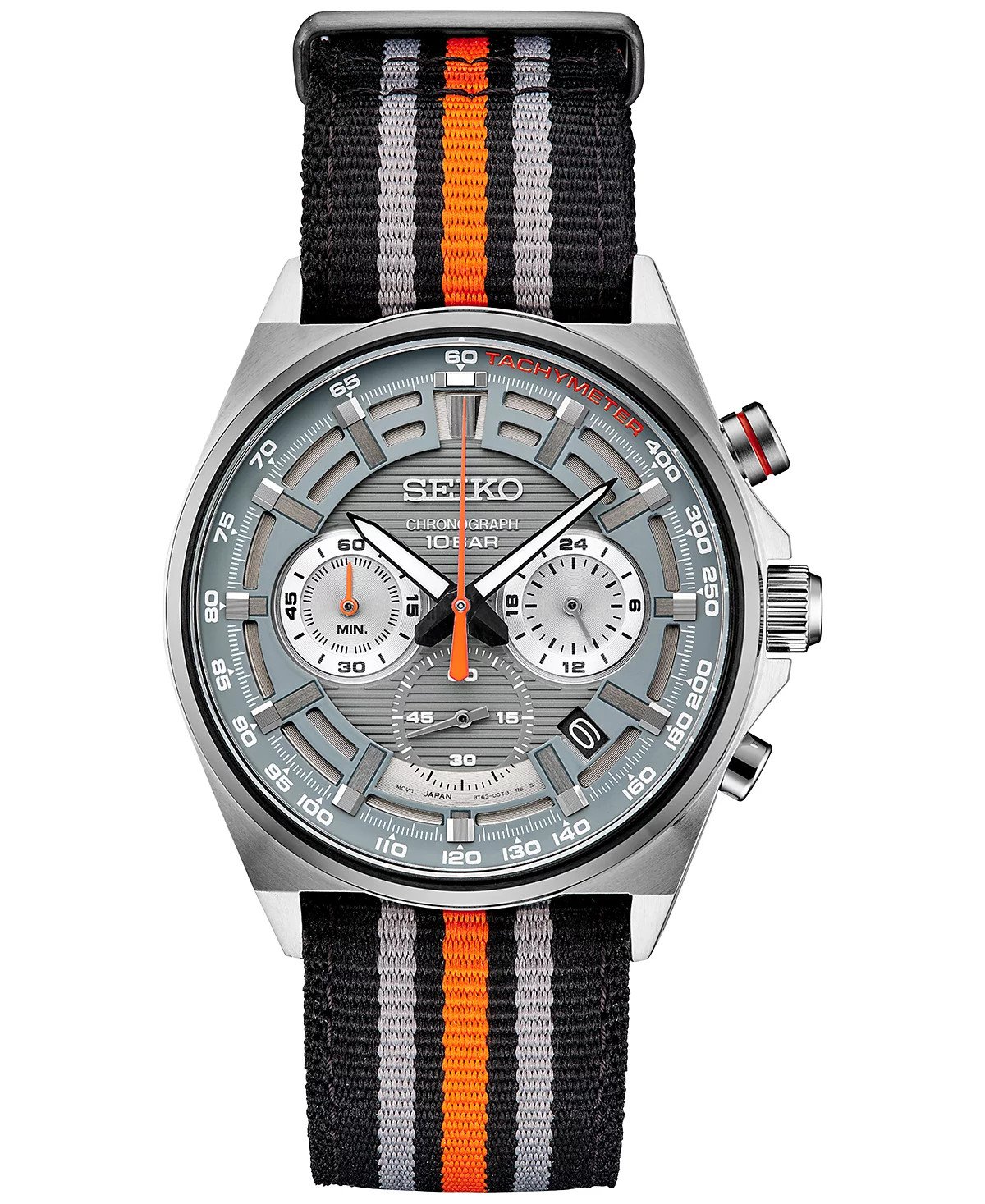 From the Essentials Collection. Inspired by racing, this rugged chronograph combines functionality and fashion for perfect sport or everyday wear. Framed by a gray tachymeter outer ring, the dimensional embossed gray dial features applied metallic elements and orange accents. Designed to resemble an engine compartment, the dial also offers three subdials, including a 24-hour indicator, a date calendar, and LumiBrite hands and markers. Chronograph timing provides measurement of up to 60 minutes of elapsed time in 1/5-second increments. Crafted of stainless steel with black, gray and orange racing stripe nylon strap. 10 bar, 100M Water Resistant