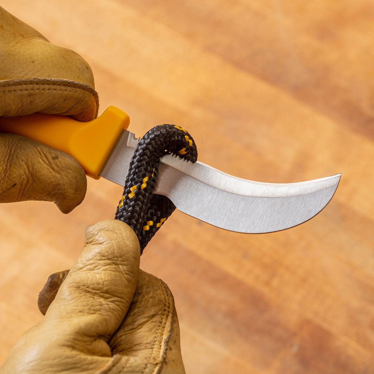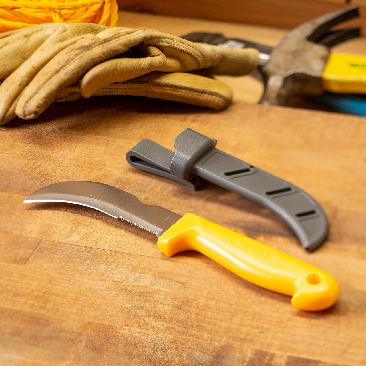 Smith's EdgeWork-Site 4" Hawk Bill blade features a satin finish that provides extra protection while providing a rugged look. The razor-sharp Hawk Bill blade is made of precision heat-treated 3Cr13 Stainless Steel with 1" serrated section to utilize the full length of the blade. Equipped with rugged polypropylene textured handle and hard sheath with pocket clip. The curved blad is designed for pull cuts and splicing.