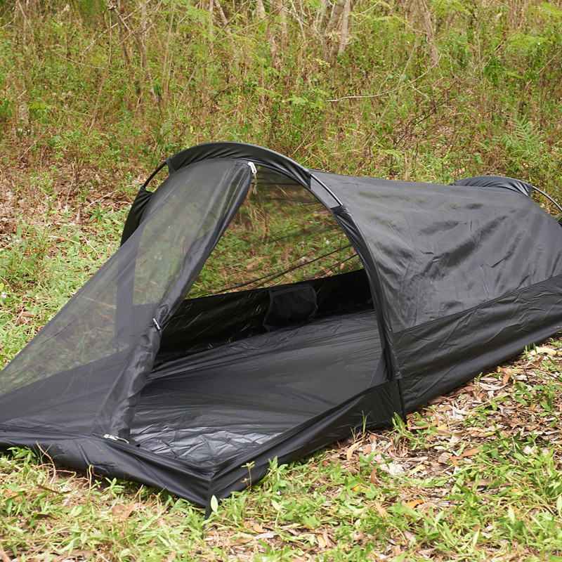 The Ionosphere™ IX is an extremely small, compact one-person tent. With a two-pole, easy to pitch design, the tent forms a hooped shelter that keeps condensation build-up to a minimum. The inner tent is made of a No-See-Um mesh mosquito net to not only keep out bugs, snakes, etc. but it can also be used without the fly as a stand-alone mosquito shelter/barrier in the summer months and warmer climates.