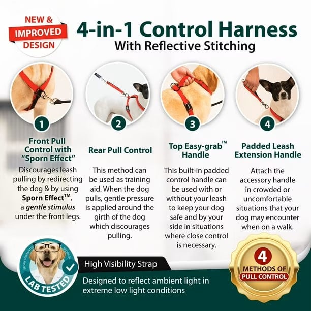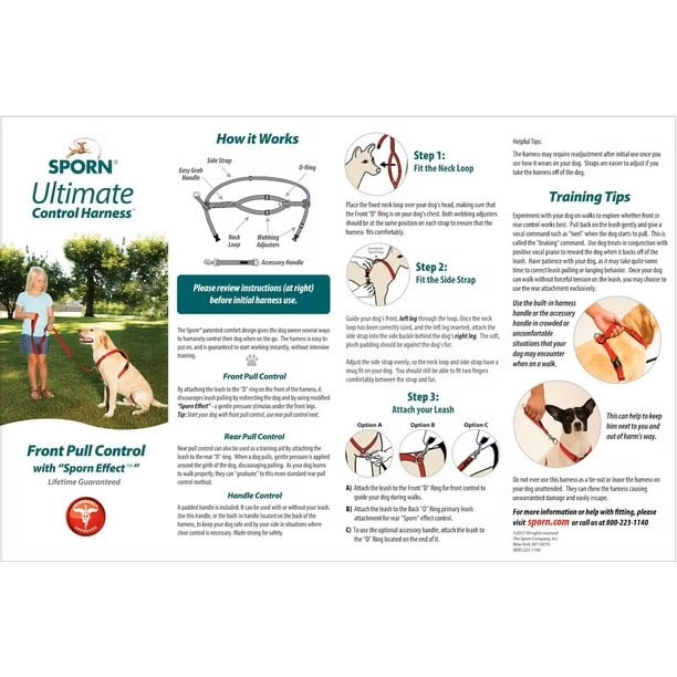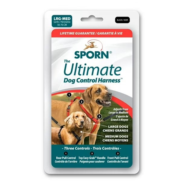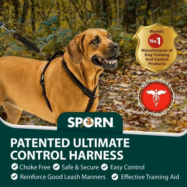 The Sporn Ultimate Control Harness™ features a patented, comfort design that gives the dog owner several ways to humanely control their dog when on the go. It's designed for moderate to heavy pullers. It's easy to put on and is guaranteed to start working instantly, using the "Sporn Effect", without intensive training! The Ultimate Control Harness™ is fully padded for comfort and contains reflective stitching for safe night walking. Neck and girth straps are fully adjustable to ensure a proper fit.