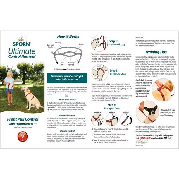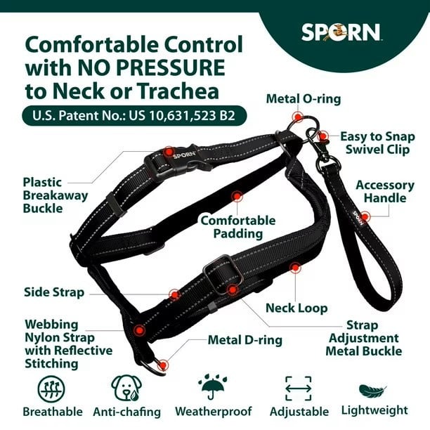 The Sporn Ultimate Control Harness™ features a patented, comfort design that gives the dog owner several ways to humanely control their dog when on the go. It's designed for moderate to heavy pullers. It's easy to put on and is guaranteed to start working instantly, using the "Sporn Effect", without intensive training! The Ultimate Control Harness™ is fully padded for comfort and contains reflective stitching for safe night walking. Neck and girth straps are fully adjustable to ensure a proper fit.