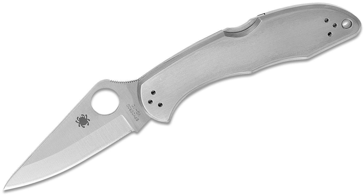 The Spyderco C11P Delica 4 Folding Knife combines lightweight design with robust functionality. Featuring a sleek, stainless steel handle, this knife fits comfortably in hand, making it ideal for everyday carry. The 2-7/8" VG10 stainless steel blade, now with enhanced slip-resistant jimping, offers superior cutting performance and durability. A larger thumb hole promotes quick, easy access, while the versatile 4-way clip design allows for customizable carry options. Weighing just 4 oz., it's both practical and stylish, and the smooth handle surface invites personalization. Crafted in Seki-City, Japan, the Delica 4 is a testament to quality and craftsmanship.
