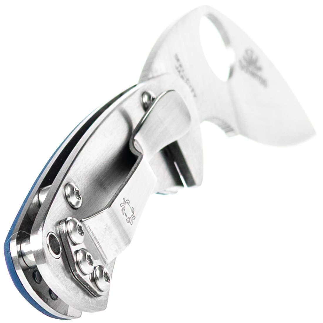 The satin-finished blade is paired with a unique handle featuring a stainless steel scale on one side and a stainless liner and peel-ply-textured G-10 scale on the other. The stainless scale is precision machined to create a sturdy Reeve Integral Lock (R.I.L.) mechanism, while the G-10 scale is cobalt blue—one of the signature hues of our CPM SPY27 family. Both scales provide mounting holes for a stainless steel pocket clip that is reversible for left or right-side tip-up carry.