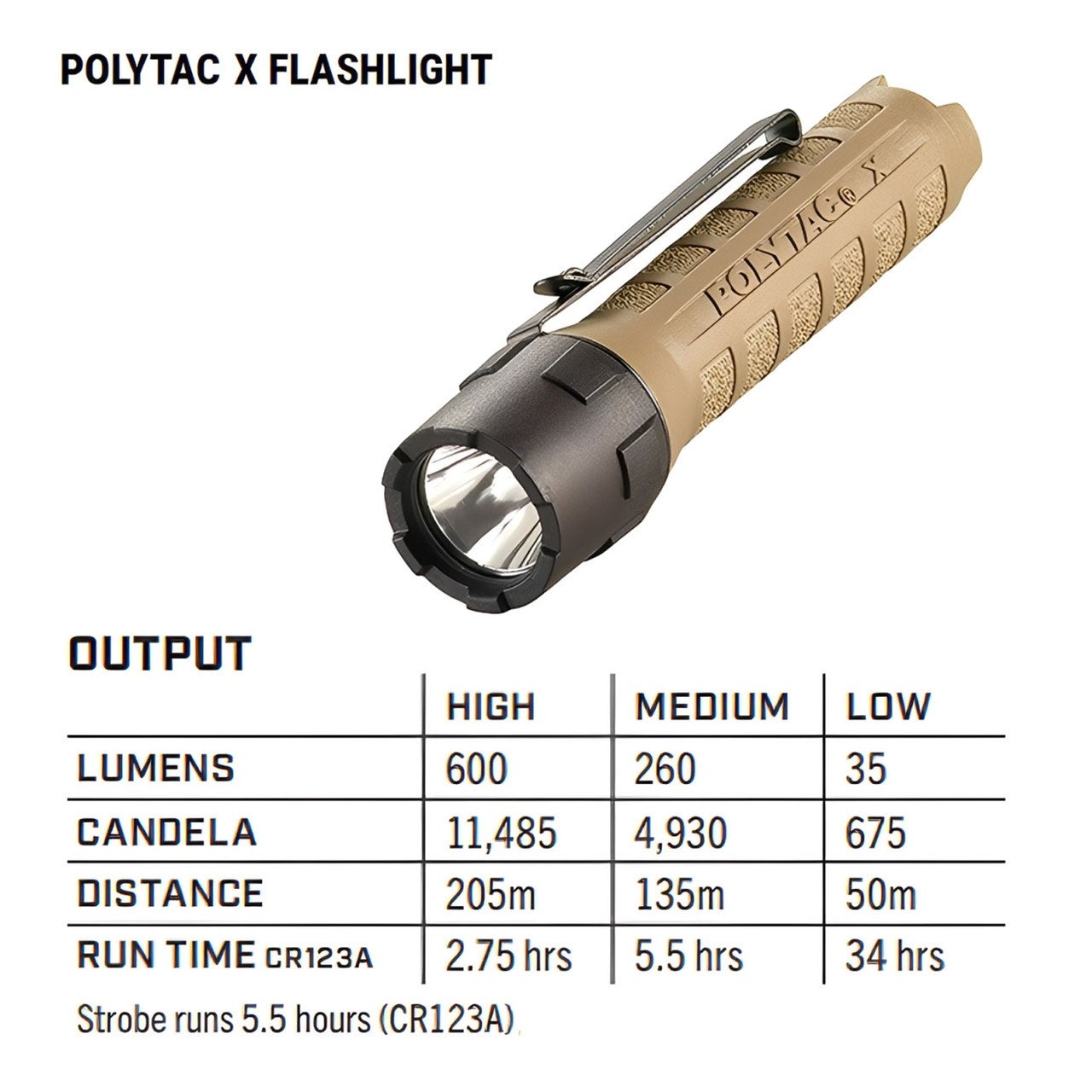 The Streamlight PolyTac X is a rugged, high-performance tactical flashlight designed for reliability in demanding environments. Powered by either two CR123A lithium batteries or one SL-B26 battery pack, it delivers an impressive 600 lumens on High, with additional Medium, Low, and Strobe modes for versatile illumination. Its TEN-TAP Programming lets you select from three customizable operating profiles, ensuring the light functions exactly the way you need it to.