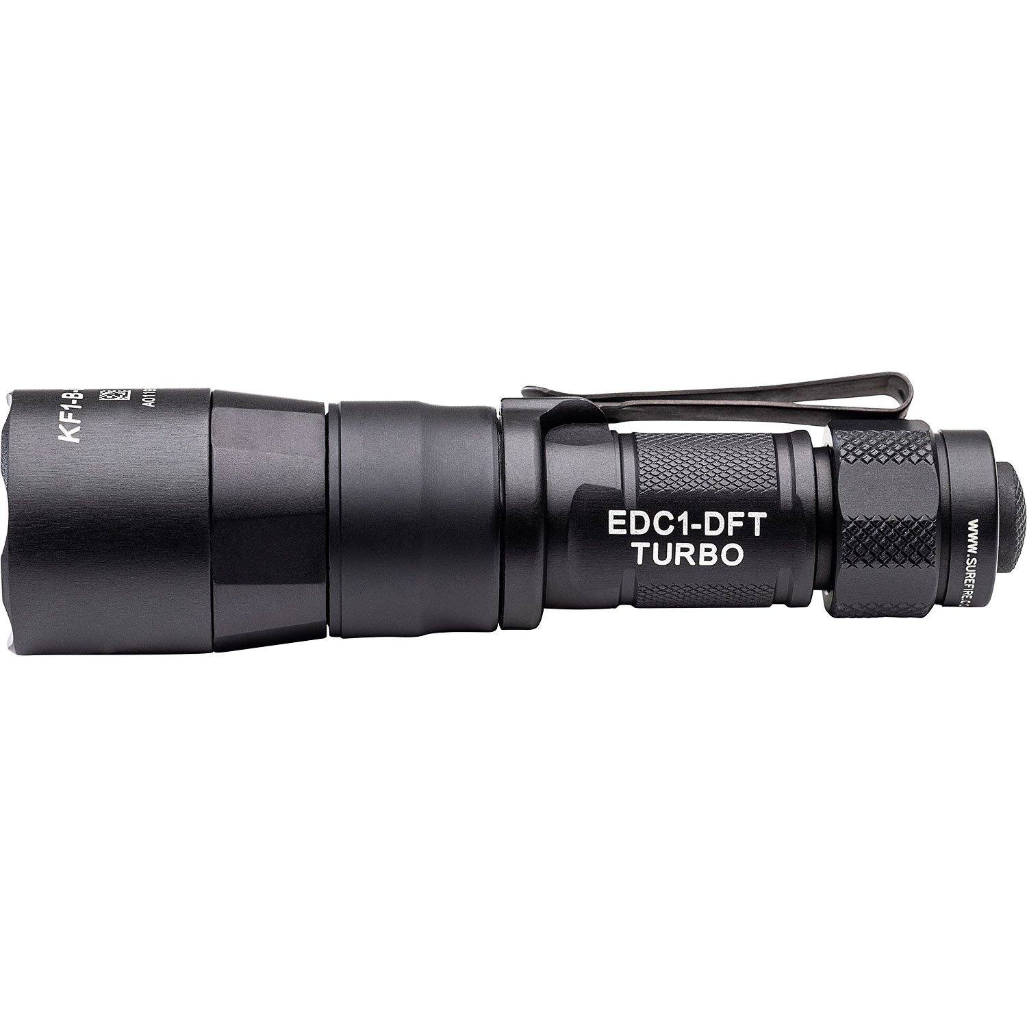 Turbocharge Your Low-Light Vision. SureFire’s Everyday Carry Series punches deep into darkness with the EDC1-DFT, a Dual Fuel, high-candela handheld flashlight that delivers impressive beam designed explicitly for long-distance illumination in a remarkably compact form factor. With a blinding, peak beam intensity of 95,000 candela using the included SF18350 rechargeable lithium-ion battery or 55,000 candela from a single 123A primary battery, the EDC1-DFT's concentrated, tightly focused beam pattern allows you to see farther into the darkness and positively identify any potential threat. In addition, it offers tremendous versatility by providing ample spill light to help the user maintain situational awareness. Constructed of lightweight aerospace aluminum, Mil-Spec hard-anodized, and O-ring sealed to keep out the elements, the body and tailcap are also knurled for a secure grip. A sturdy, two-way clip offers the added flexibility of bezel-up or bevel-down carry. The EDC1-DFT delivers SureFire quality, performance, and dependability in an everyday carry flashlight that provides peace of mind by helping you see farther into the unknown.