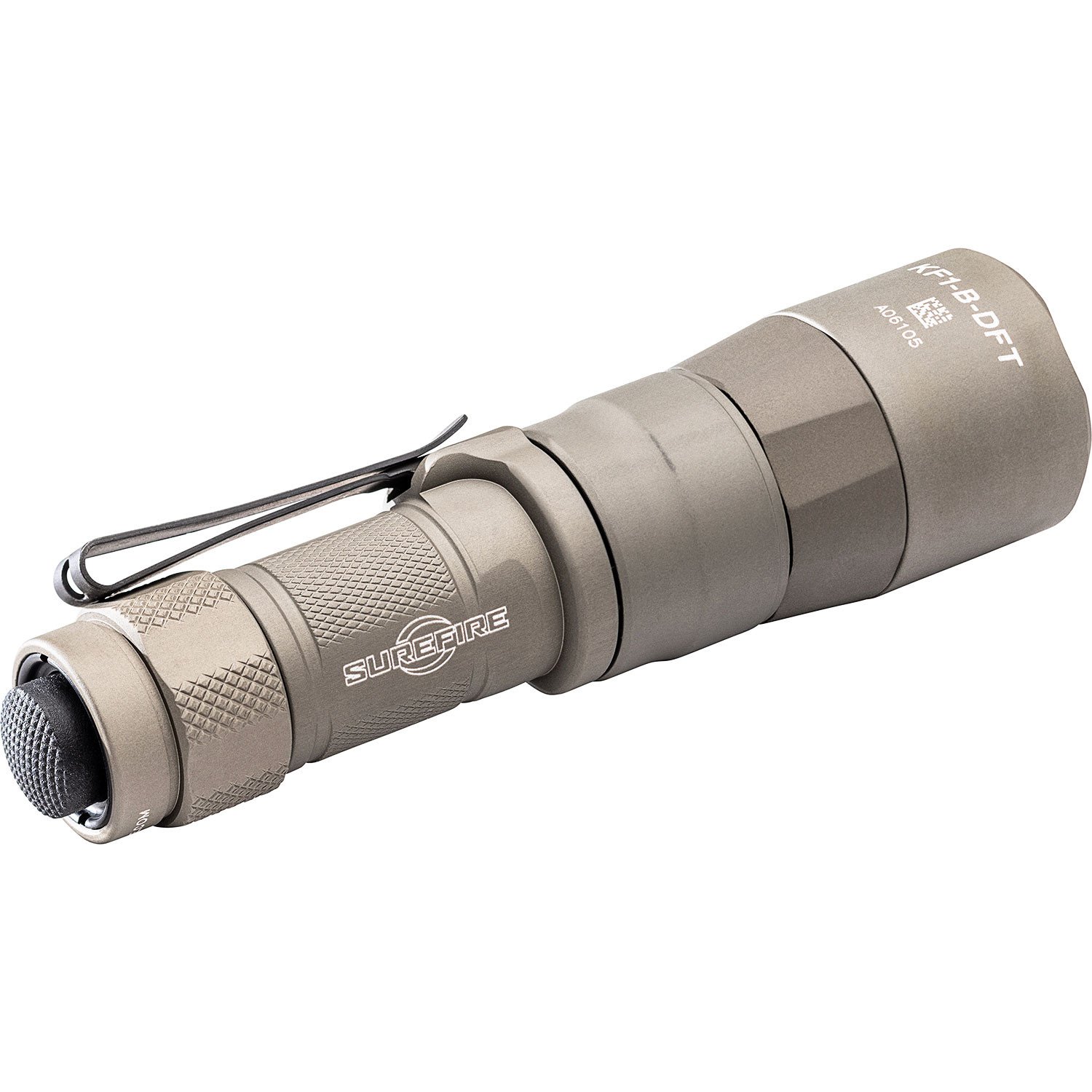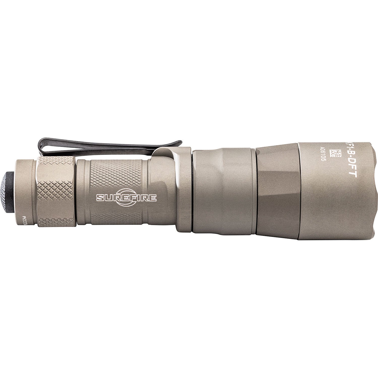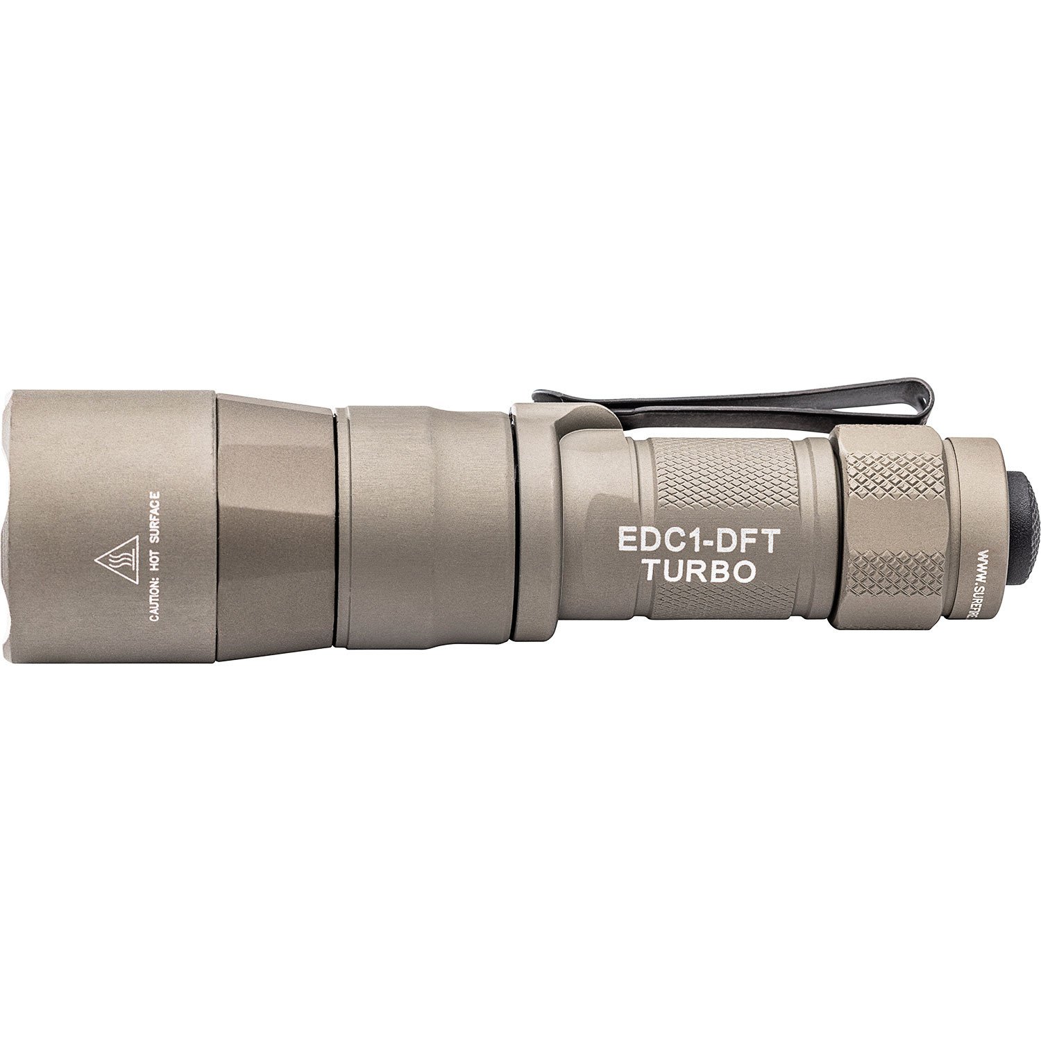 Turbocharge Your Low-Light Vision. SureFire’s Everyday Carry Series punches deep into darkness with the EDC1-DFT, a Dual Fuel, high-candela handheld flashlight that delivers impressive beam designed explicitly for long-distance illumination in a remarkably compact form factor. With a blinding, peak beam intensity of 95,000 candela using the included SF18350 rechargeable lithium-ion battery or 55,000 candela from a single 123A primary battery, the EDC1-DFT's concentrated, tightly focused beam pattern allows you to see farther into the darkness and positively identify any potential threat. In addition, it offers tremendous versatility by providing ample spill light to help the user maintain situational awareness. Constructed of lightweight aerospace aluminum, Mil-Spec hard-anodized, and O-ring sealed to keep out the elements, the body and tailcap are also knurled for a secure grip. A sturdy, two-way clip offers the added flexibility of bezel-up or bevel-down carry. The EDC1-DFT delivers SureFire quality, performance, and dependability in an everyday carry flashlight that provides peace of mind by helping you see farther into the unknown.