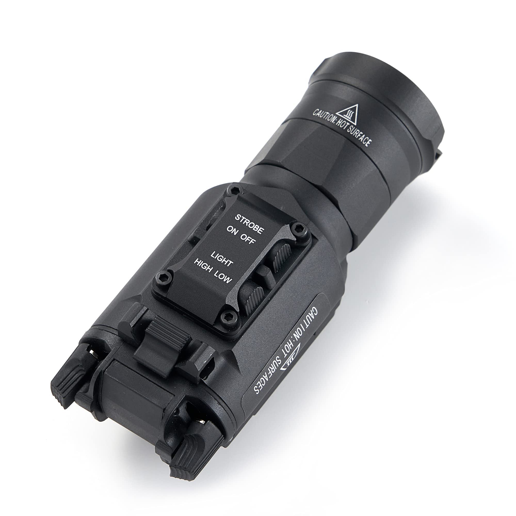 The XH35 includes two mode selector switches. One for toggling between 1,000 blinding lumens of light to gain a superior advantage in the dark and 300 potent lumens when less light is needed, but there is still the need to engage a threat in low-light conditions. The second switch toggles between continuous light operation and a disorienting strobe mode. Activating the XH35 is achieved via one-finger, ambidextrous switching located at the rear of body. Optional DG grip switches (for pistols), which allow for surgical activation without altering your grip on the weapon at all, are also available. And the versatile XH35 can be easily and securely attached to any pistol or long gun equipped with a Universal or Picatinny rail via its Rail-Lock system.