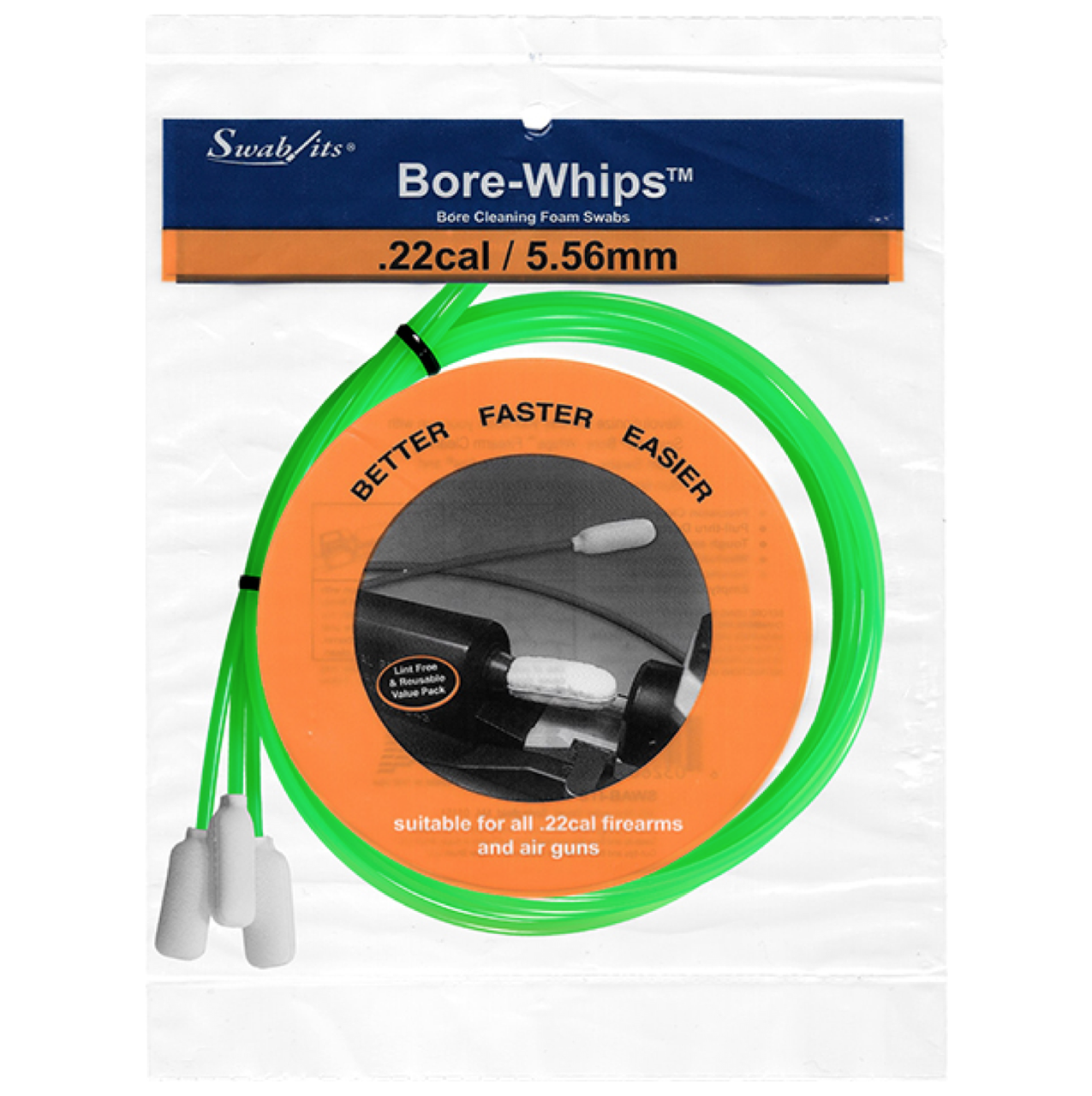 22 cal Bore-whips feature one-piece construction, no metal components, pull-through cleaning and act as an empty chamber indicator.