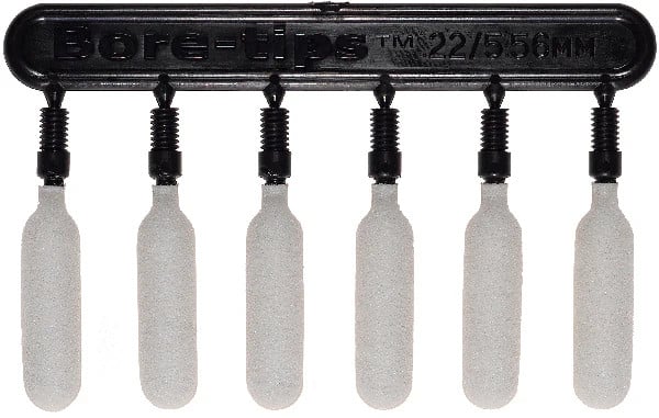 .22/5.56 Bore-tips are tough, reusable foam tips engineered for 100% bore contact; spreading fluids more evenly than mops and patches without lint or fibers. Their non-abrasive foam allows them to be run in both directions, while their absorbency requires less solvent/lubricant. Washable and reusable, they affix to a standard rod with 8/32 threading.